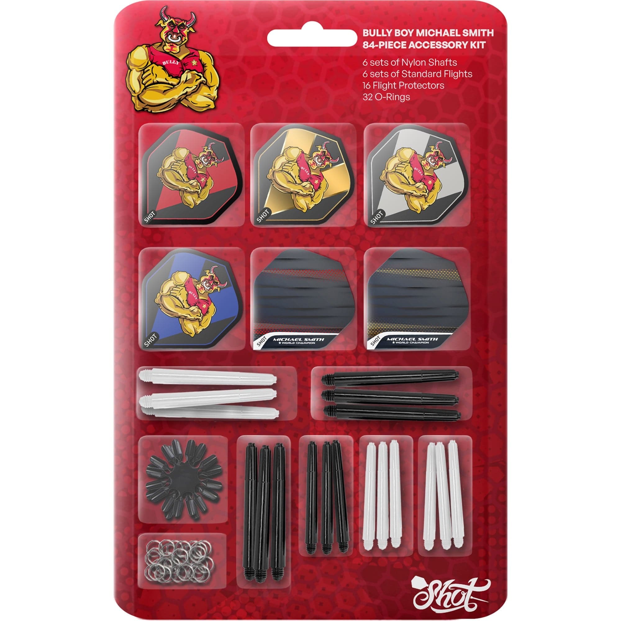Play like a World Champion with this ultimate 84-piece accessory pack. Pack includes six sets (18 pieces) of assorted Bully Boy Michael Smith dart flights. In custom designs, durable 75 microns in standard shape. With six sets (18 pieces) of durable nylon shafts in various lengths, this is the perfect kit for experimenting and fine-tuning your throw. Complete with 16 Flight Protectors to reduce tearing and 32 Shaft Rings to keep flights fitted securely to dart shafts.