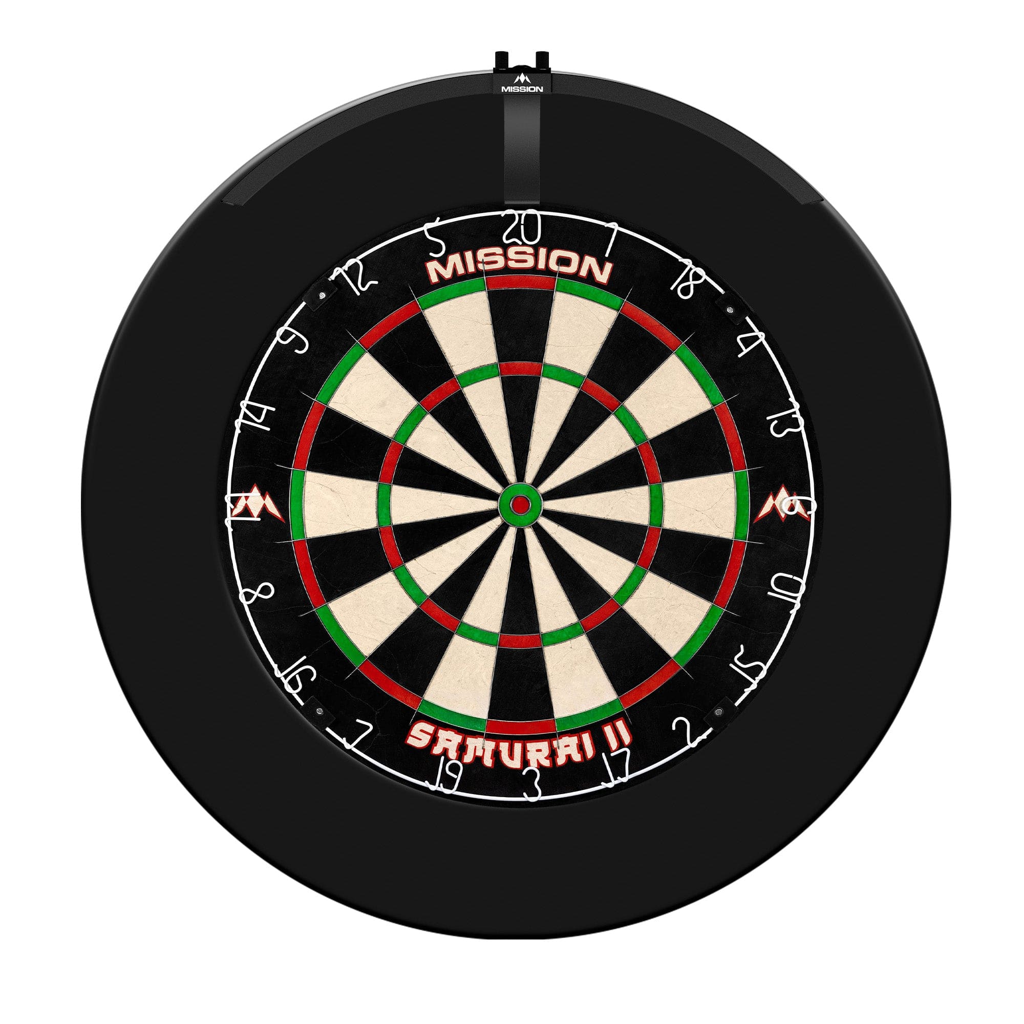 Mission Samurai II Dartboard Set - Dart Board, Surround & Torus 100 Light - Black. Light up your game with the Samurai II, Surround & Light Bundle! This set includes a professional dartboard, a durable surround, and a high-quality Torus dartboard light to ensure perfect visibility for every throw. Ideal for home players and serious competitors. Tournament-grade dartboard with a razor-thin wire system. Protective surround to guard against stray darts. Bright LED lighting for clear vision and precision aiming