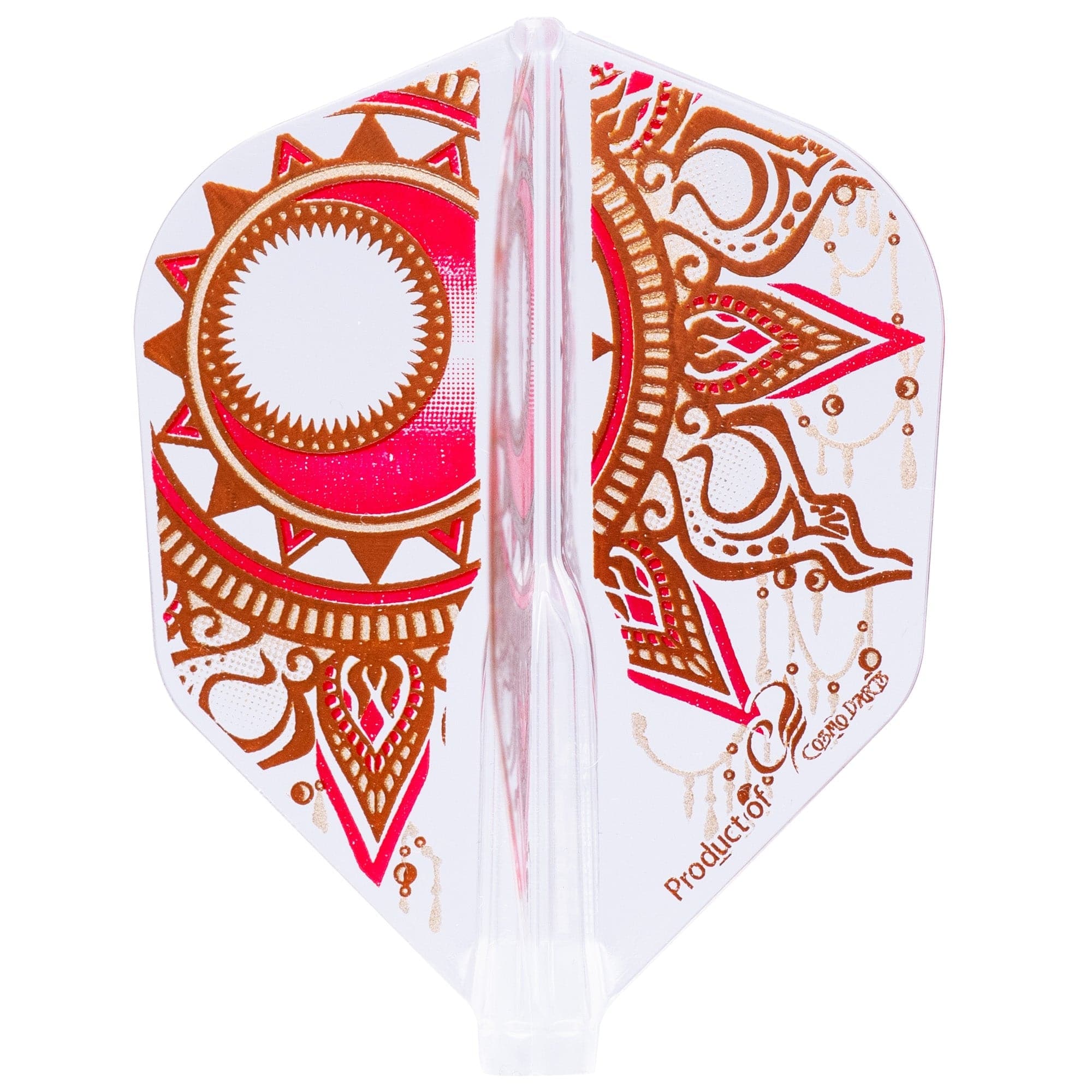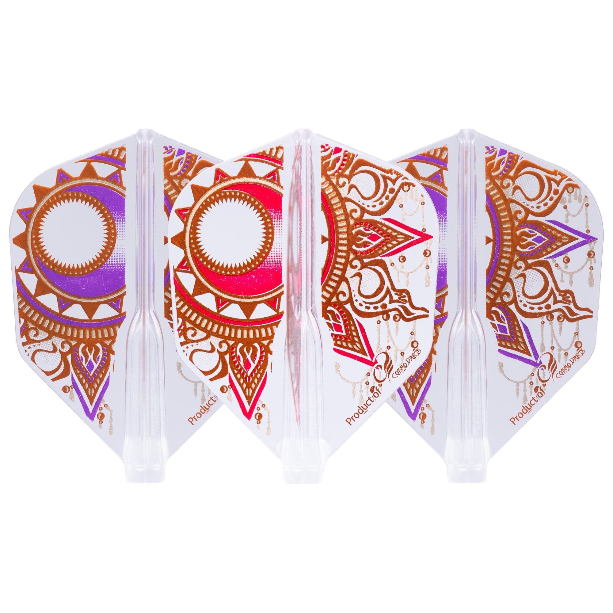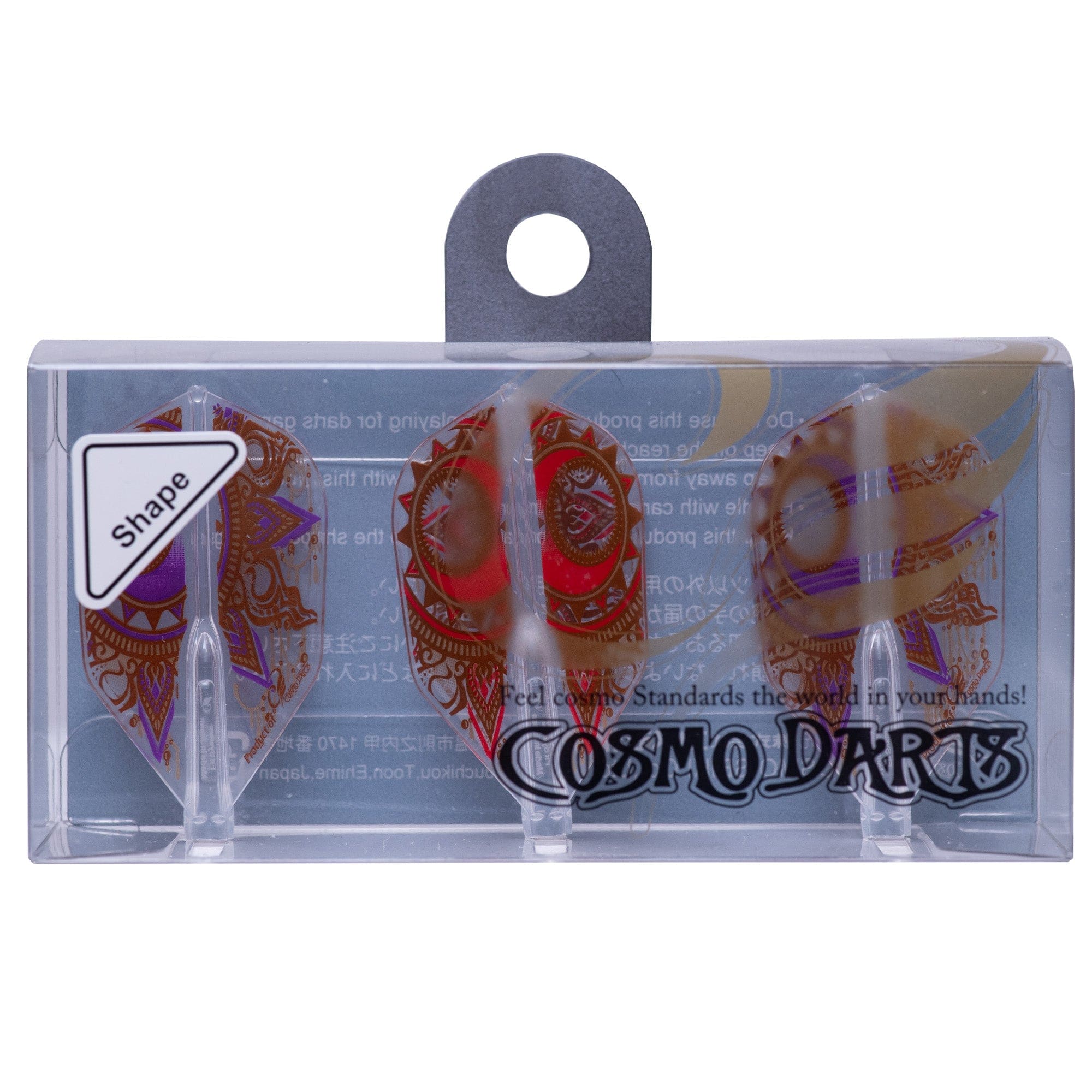Cosmo Fit Flight AIR - Ami Komiyama - Standard - Clear - Mix - Sun. These fit flight models feature Ami's own design featuring a sun in purple and red on a clear base. The AIR model is 30% thinner than the standard version. The flights are to be used with any Cosmo Fit Shaft. Each pack contains 3 flights.