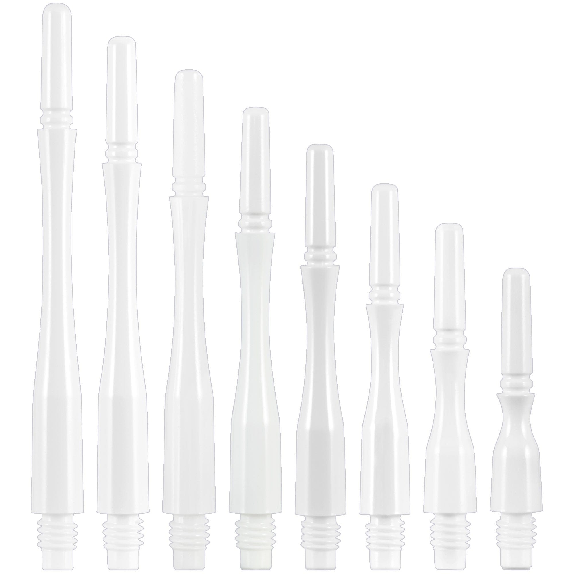 Cosmo Fit Shaft Gear in white are made from a polycarbonate resin to strengthen the stem at both the screw thread and the base of the top. These size 7 spinning white stems have a rounded top to allow the flight to rotate and the hybrid stem profile is concave towards the top of the stem, and a wider base where it screws into the barrel. The given length of these size 7 white stems is what is visible when the dart is fully assembled. Shaft length: 38mm
