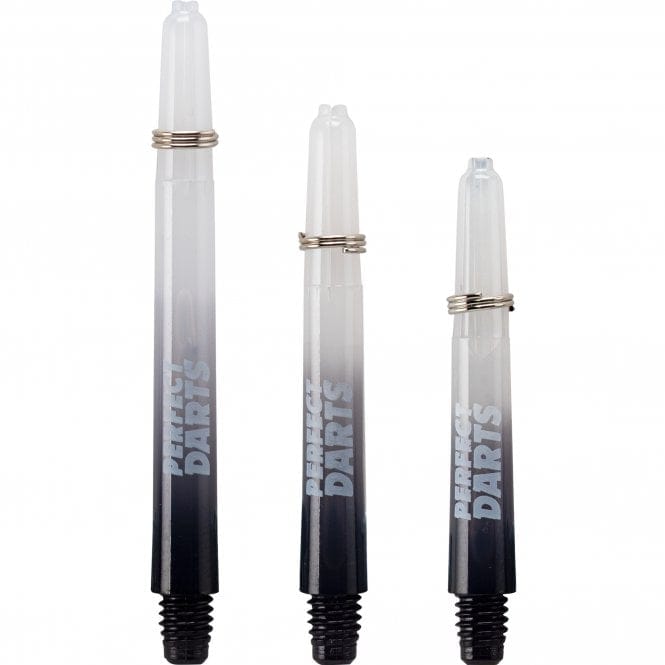Perfect Darts - Two Tone Polycarbonate Shafts. Strong Polycarbonate Shafts. Each pack contains 3 Sets (9 Shafts). Perfect Darts - Two Tone Shafts - Polycarbonate - Black & Smokey - 3 Sets Pack - Short - Tough Poly Plastic dart Stems with Bright Colouring.