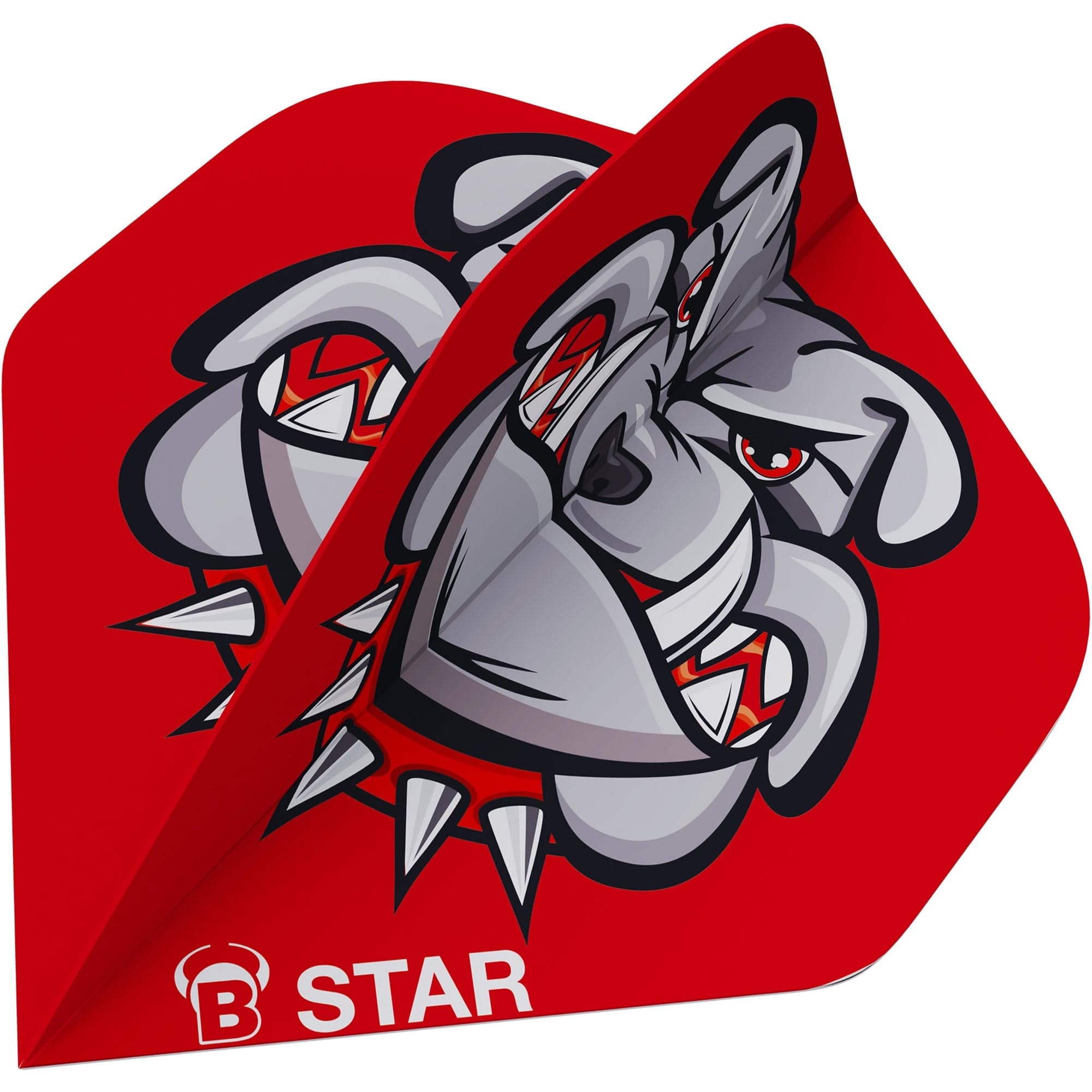 BULL'S B-Star Dart Flights - 100 Micron - A-Std - Bulldog - F4216. This flight is made from the most popular 100 Micron material, in the B-Star Flight series in standard A-Shape. This design features a bulldog image on a red background. Each pack contains 3 flights.