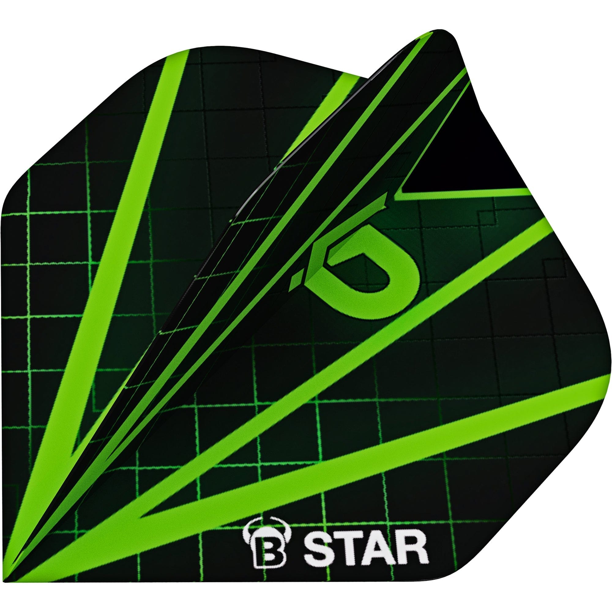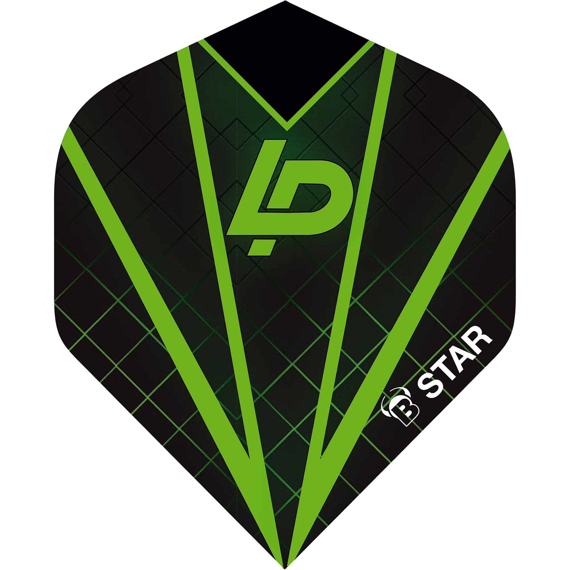 BULL'S B-Star Dart Flights - 100 Micron - A-Std - Luc Peters - F4167. This flight is made from the most popular 100 Micron material, in the B-Star Flight series in standard A-Shape. This is the official flight of Luc Peters which includes his LP logo in Black and Green. Each pack contains 3 flights.