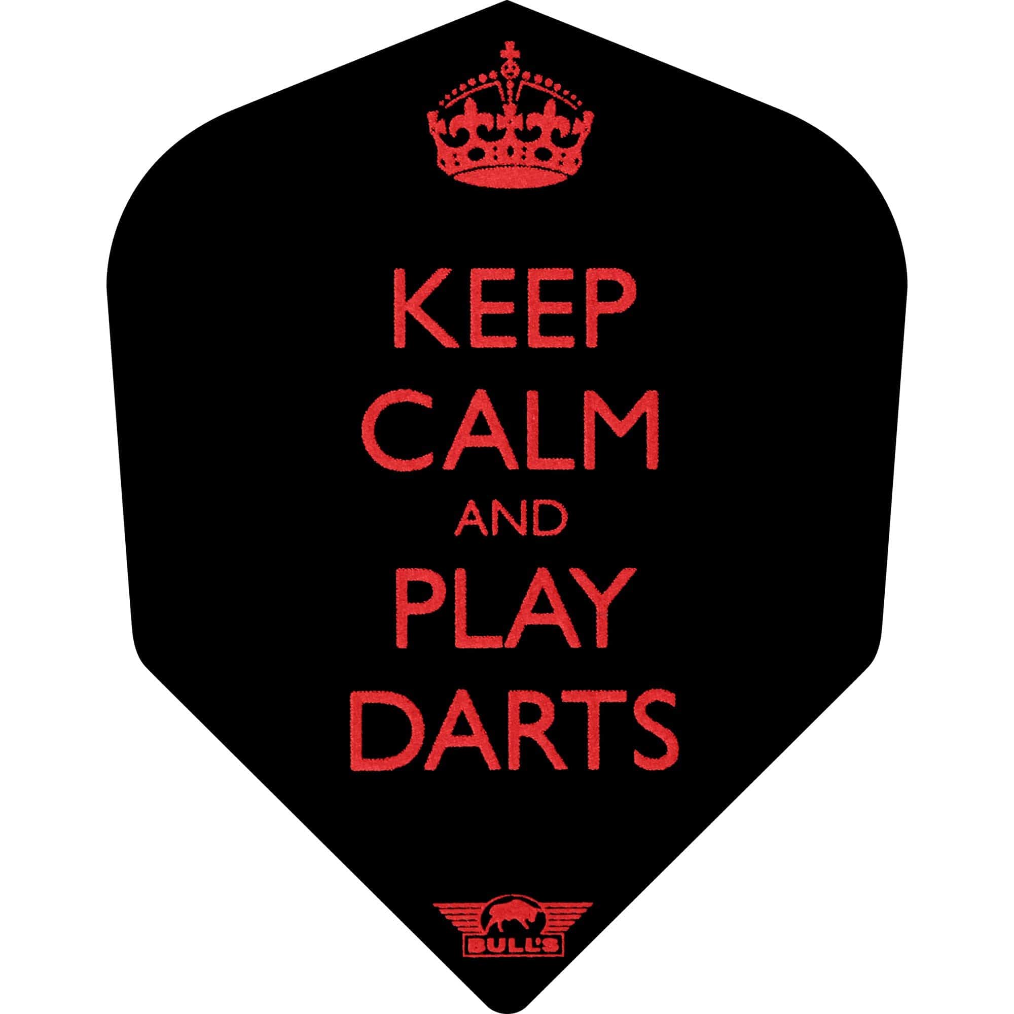 Bulls Powerflite Strong Dart Flights.100 Micron. No 6. An essential for any darts players kit. This high quality dart flight comes in a standard No 6 shape and is 100 microns thick to ensure it lasts a long time. This pack comes in a Black base with red Keep Calm and Play Darts wording and features a small crown design. Each pack contains 3 flights