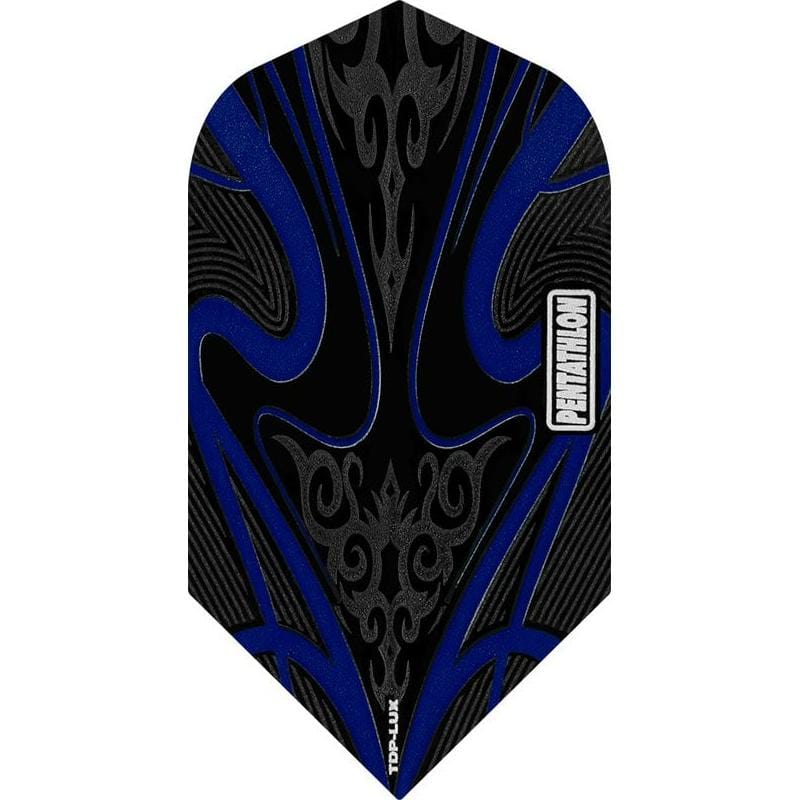 Pentathlon TDP-Lux Black Series Extra Strong 100 Micron Slim Dark Blue Dart Flights. Add some colour to your kit with the extra stong dart flights. These flights come with a Black pattered background and a swirly Dark Blue pop of colour and small Pentathalon logo on one edge of the flight. Each pack contains 3 flights.