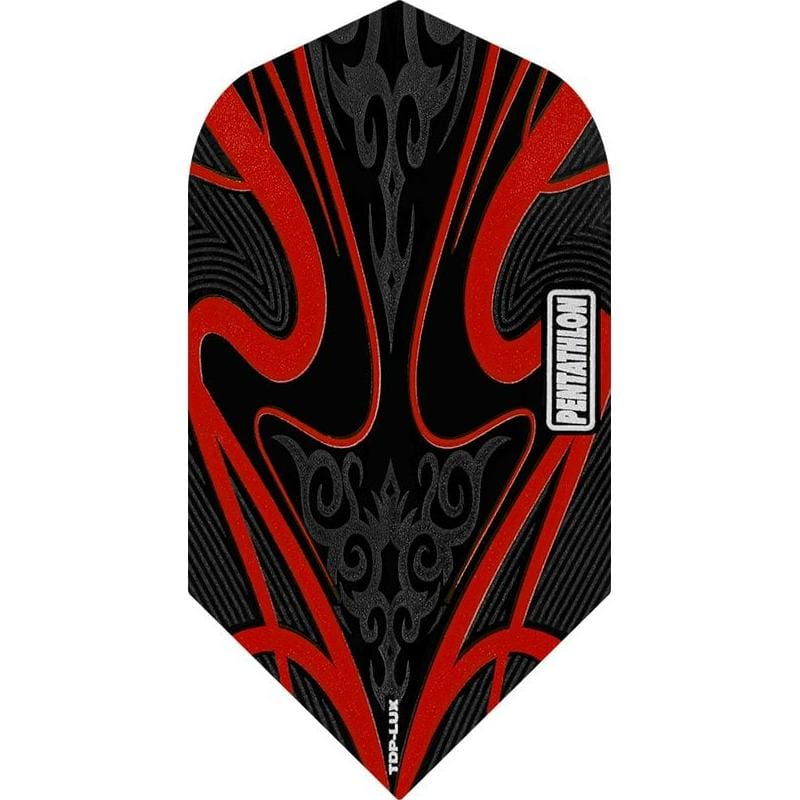 Pentathlon TDP-Lux Black Series Extra Strong 100 Micron Slim Red Dart Flights. Add some colour to your kit with the extra stong dart flights. These flights come with a Black pattered background and a swirly Red pop of colour and small Pentathalon logo on one edge of the flight. Each pack contains 3 flights.