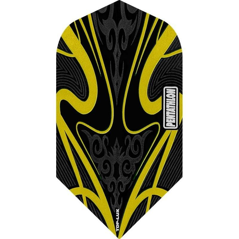 Pentathlon TDP-Lux Black Series Extra Strong 100 Micron Slim Yellow Dart Flights. Add some colour to your kit with the extra stong dart flights. These flights come with a Black pattered background and a swirly Yellow pop of colour and small Pentathalon logo on one edge of the flight. Each pack contains 3 flights.