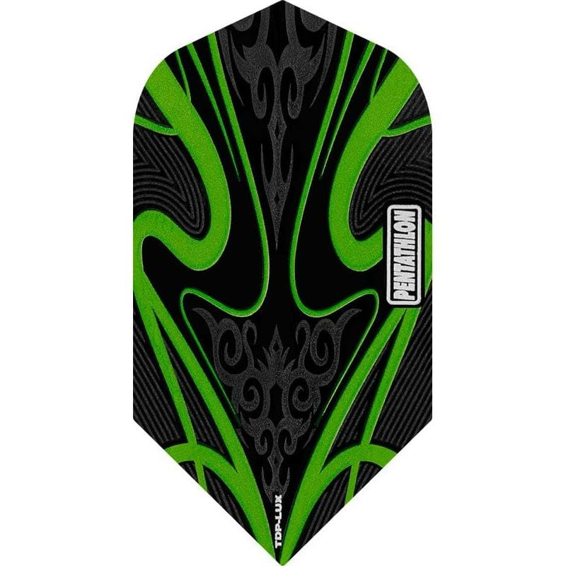Pentathlon TDP-Lux Black Series Extra Strong 100 Micron Slim Green Dart Flights. Add some colour to your kit with the extra stong dart flights. These flights come with a Black pattered background and a swirly Green pop of colour and small Pentathalon logo on one edge of the flight. Each pack contains 3 flights.