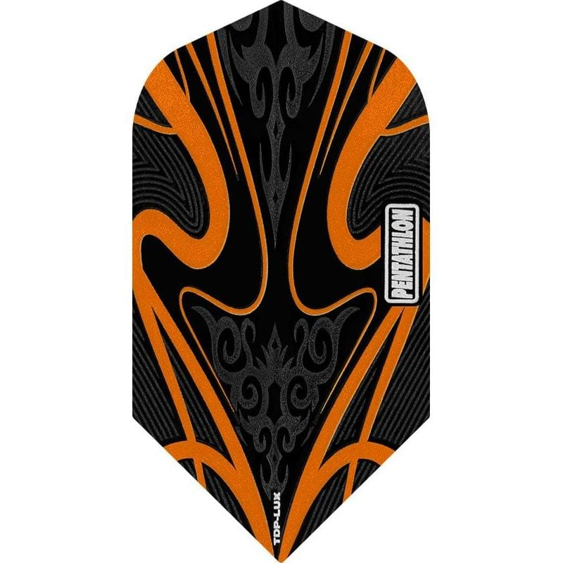 Pentathlon TDP-Lux Black Series Extra Strong 100 Micron Slim Orange Dart Flights. Add some colour to your kit with the extra stong dart flights. These flights come with a Black pattered background and a swirly Orange pop of colour and small Pentathalon logo on one edge of the flight. Each pack contains 3 flights.