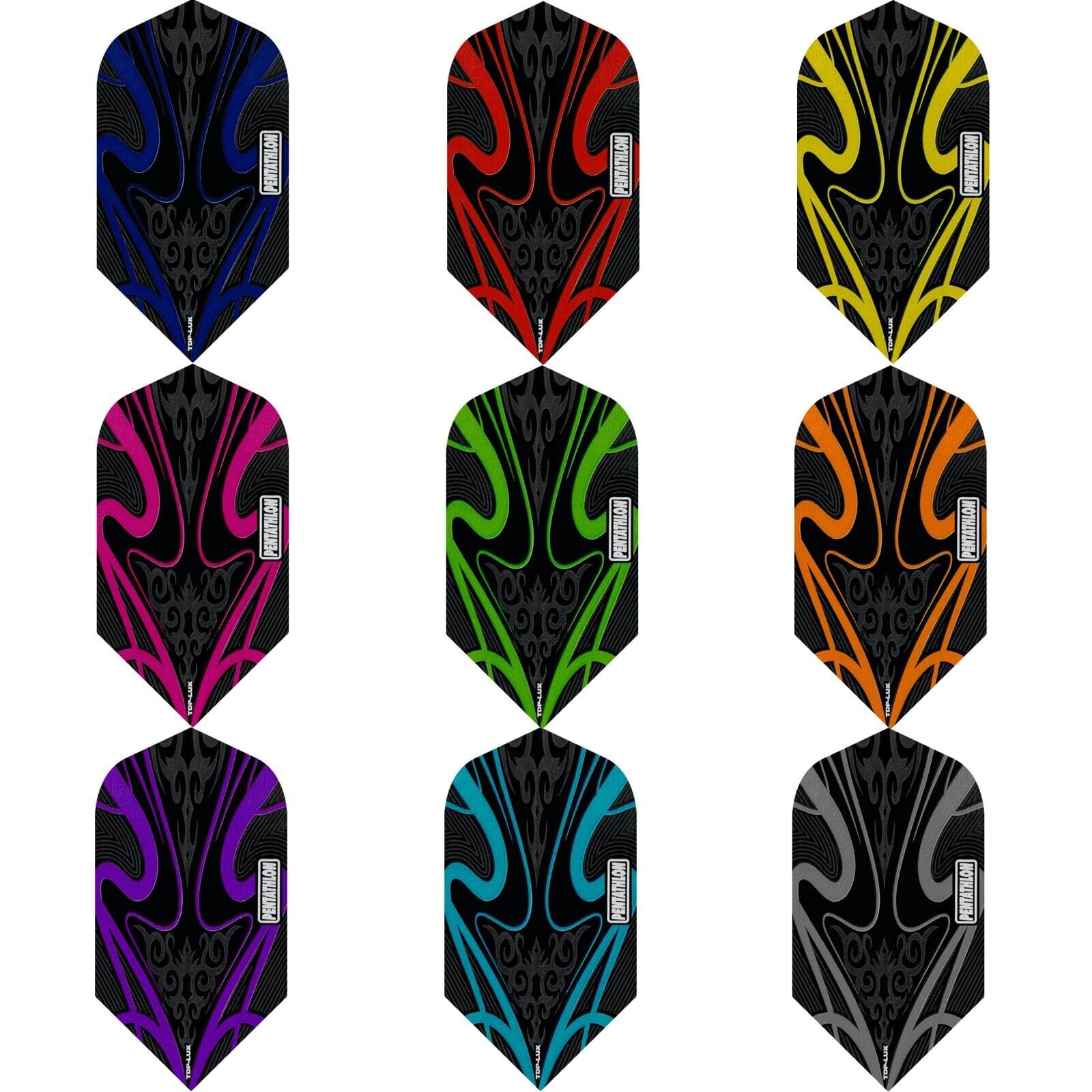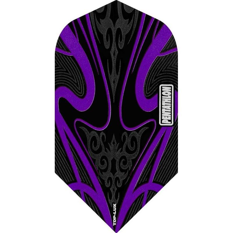 Pentathlon TDP-Lux Black Series Extra Strong 100 Micron Slim Purple Dart Flights. Add some colour to your kit with the extra stong dart flights. These flights come with a Black pattered background and a swirly Purple pop of colour and small Pentathalon logo on one edge of the flight. Each pack contains 3 flights.