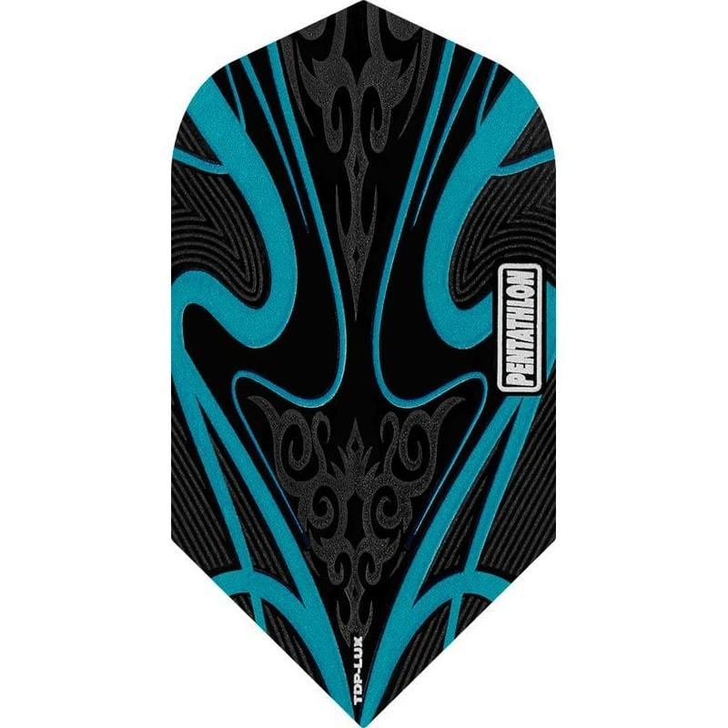 Pentathlon TDP-Lux Black Series Extra Strong 100 Micron Slim Aqua Blue Dart Flights. Add some colour to your kit with the extra stong dart flights. These flights come with a Black pattered background and a swirly Aqua Blue pop of colour and small Pentathalon logo on one edge of the flight. Each pack contains 3 flights.