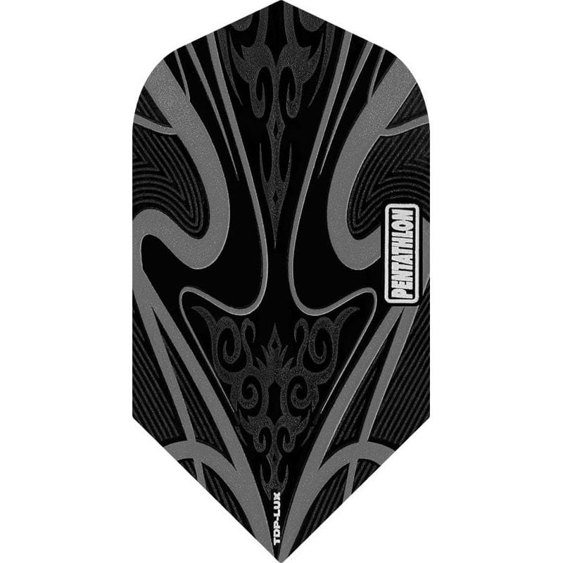 Pentathlon TDP-Lux Black Series Extra Strong 100 Micron Slim Grey Dart Flights. Add some colour to your kit with the extra stong dart flights. These flights come with a Black pattered background and a swirly Grey pop of colour and small Pentathalon logo on one edge of the flight. Each pack contains 3 flights.