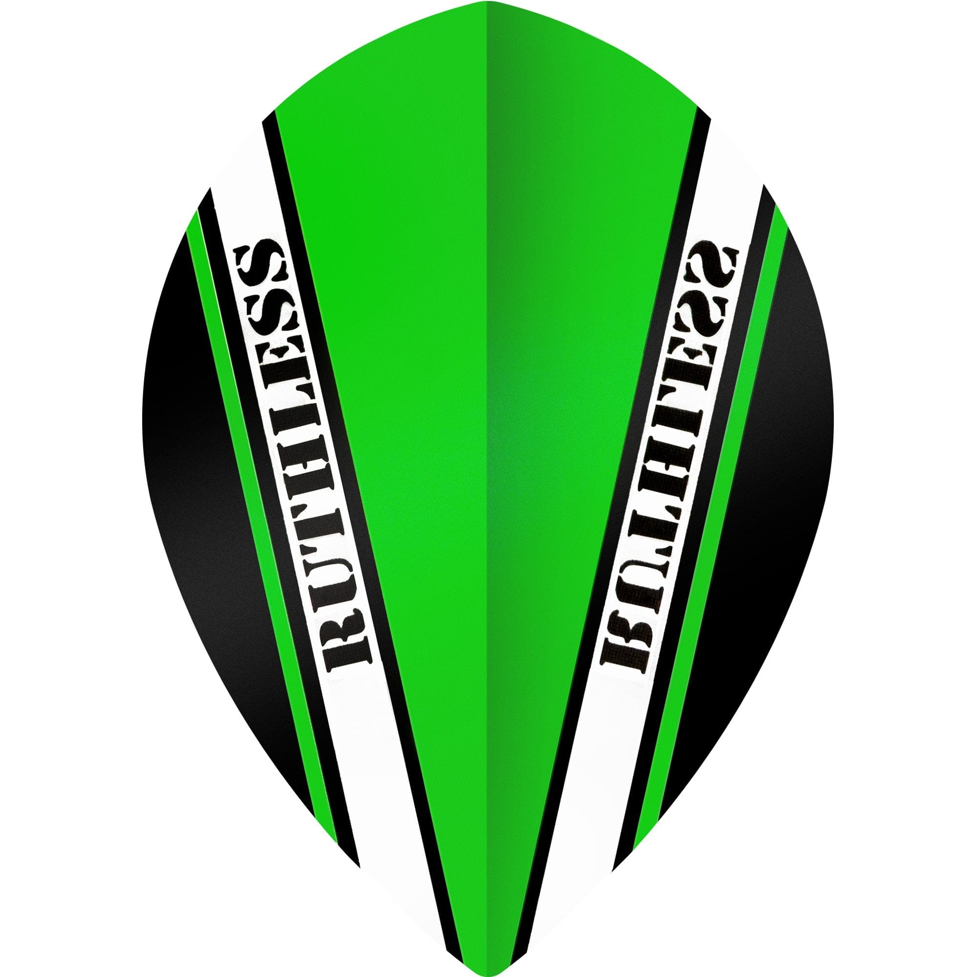 Ruthless V100 Pro Dart Flights - Extra Strong 100 Micron. Each pack contains 3 flights. Ruthless - V100 Pro - Dart Flights - 100 Micron - 20005 - Pear - Green - Super tough dart flights with striking designs in pear teardrop shape and will fit any dart stems.