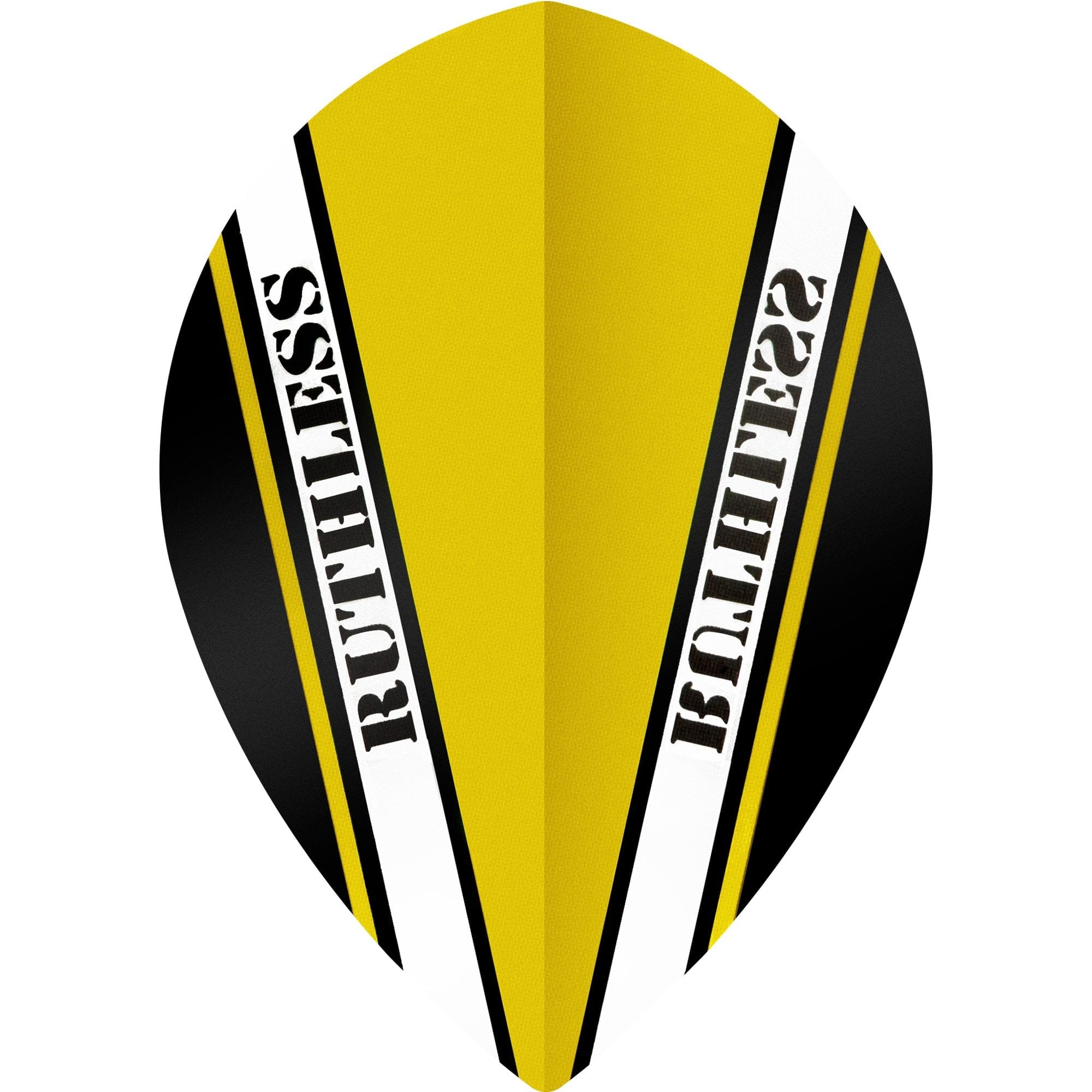 Ruthless V100 Pro Dart Flights - Extra Strong 100 Micron. Each pack contains 3 flights. Ruthless - V100 Pro - Dart Flights - 100 Micron - 20006 - Pear - Yellow - Super tough dart flights with striking designs in pear teardrop shape and will fit any dart stems.