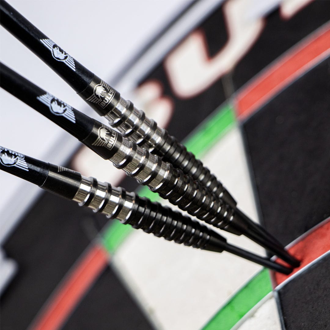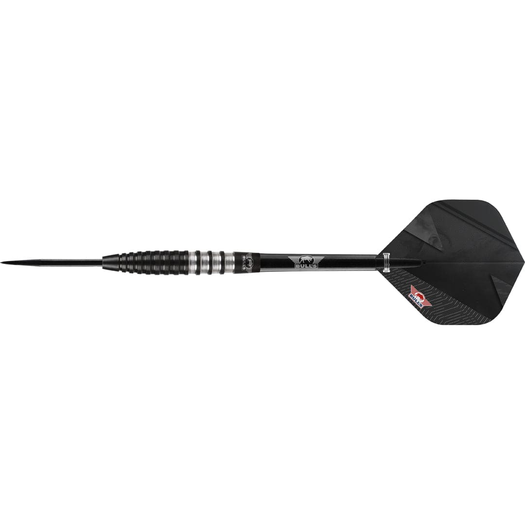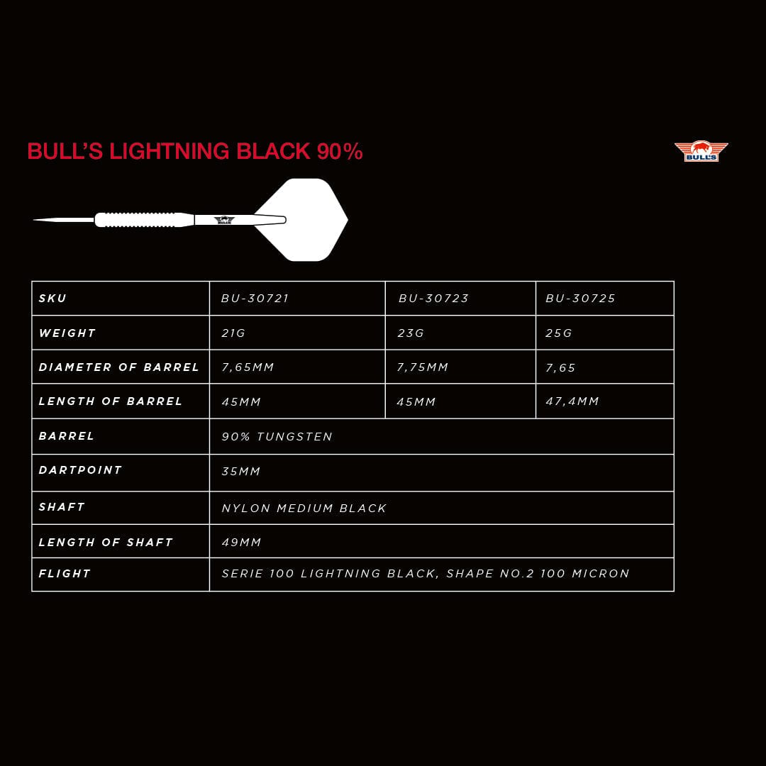 Bulls Black Lightning Darts - Steel Tip - 90% Tungsten - 23g. The Bull’s Black Lightning 90% is a dart set that is not just an addition to your collection; it is a game-changer that will elevate your performance to the next level. It was one of the best sold McKicks darts and is now revamped in Bull’s style. Each set contains 90% Tungsten barrels, shafts and flights. Thread: 2ba
