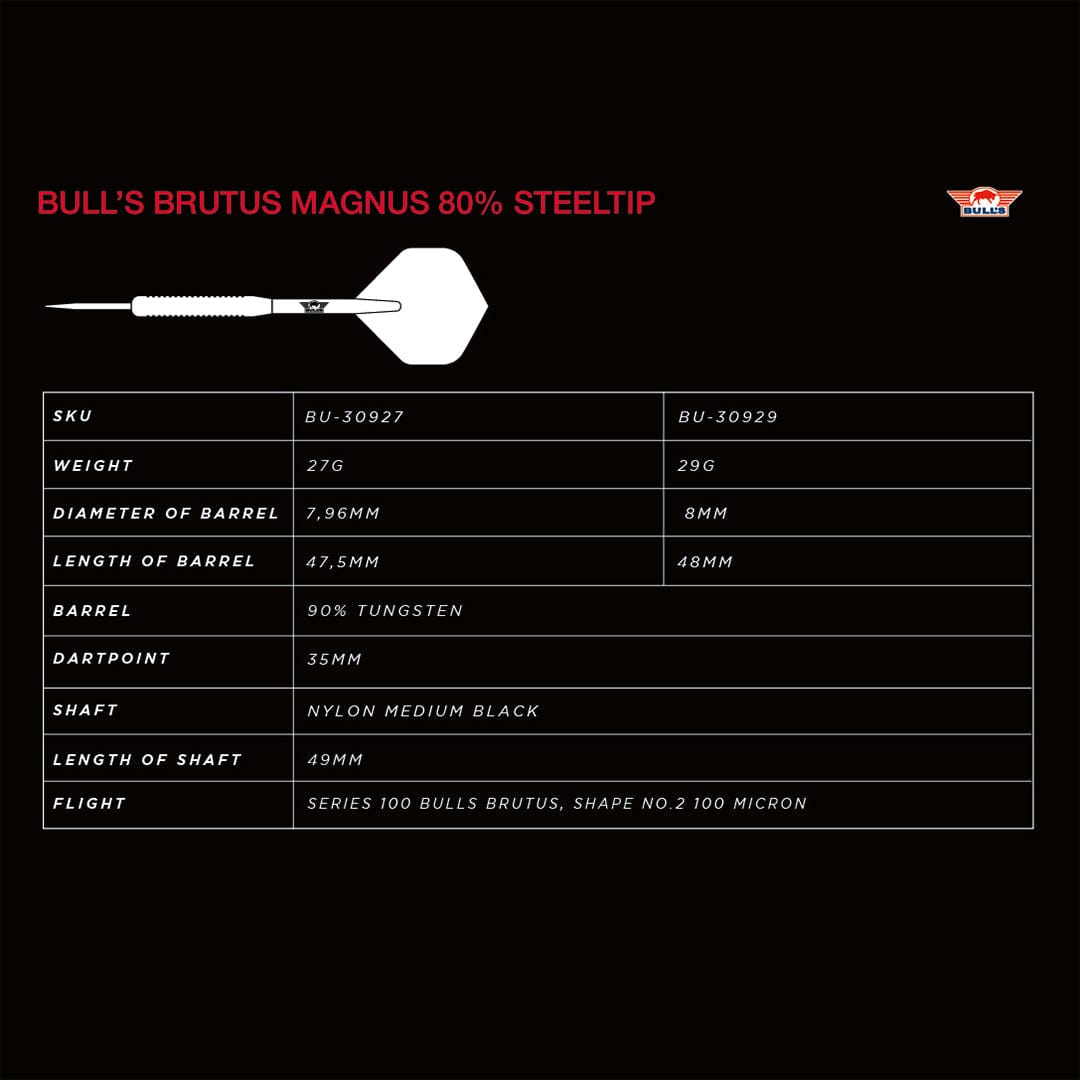 Bulls Brutus Darts - Steel Tip - 80% Tungsten - Magnus - 27g. Introducing the Bull's Brutus Magnus 80% Darts, a formidable addition to the heavyweight Brutus series. Designed for serious players, these darts offer power, precision, and excellent value, making them a top choice for competitive play. Inspired by the popular 27 grams Bull’s Classic darts barrels, they will now be sold in two different weights and a beautiful new package. Each set contains 80% Tungsten barrels, shafts and flights. Thread: 2ba