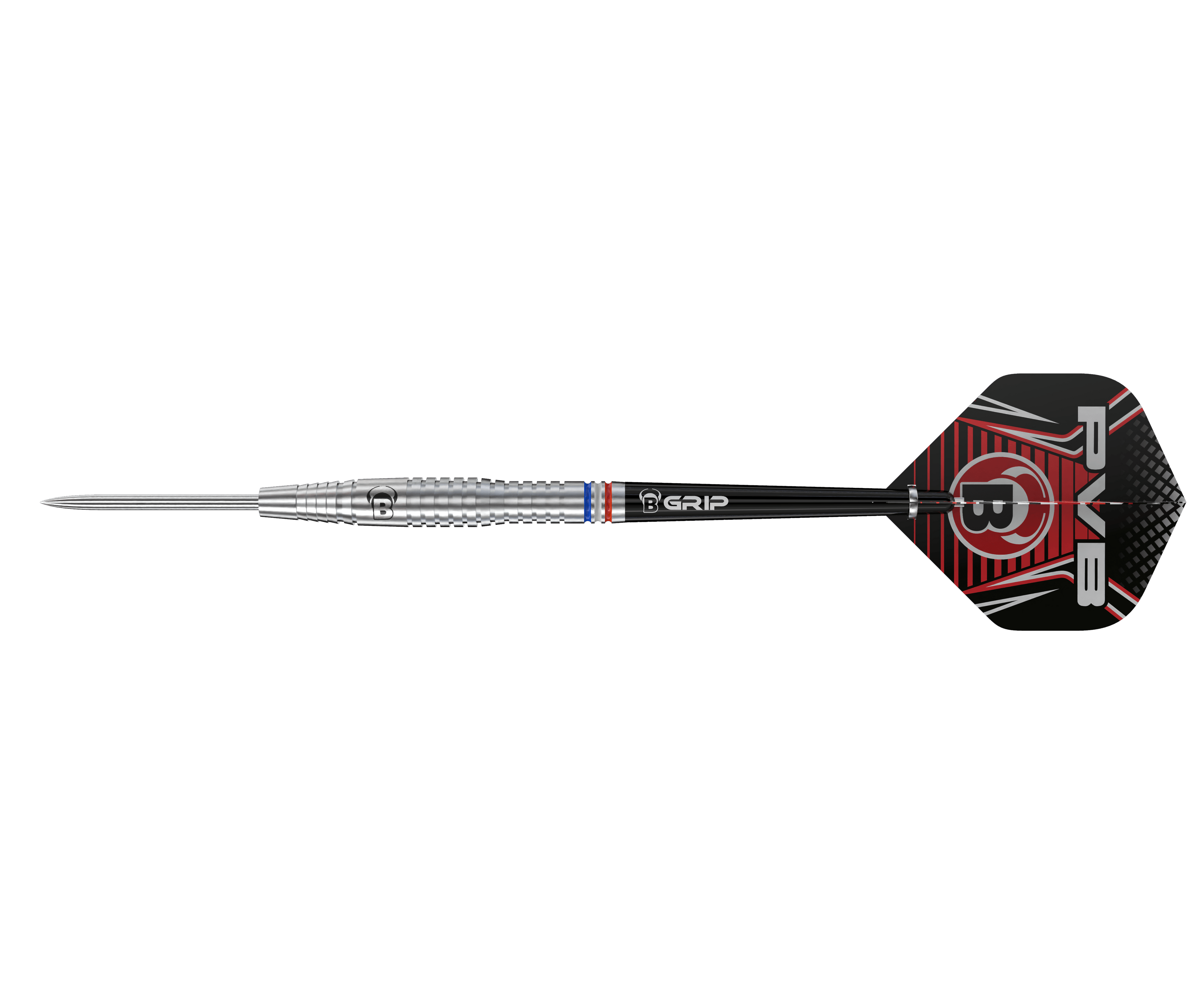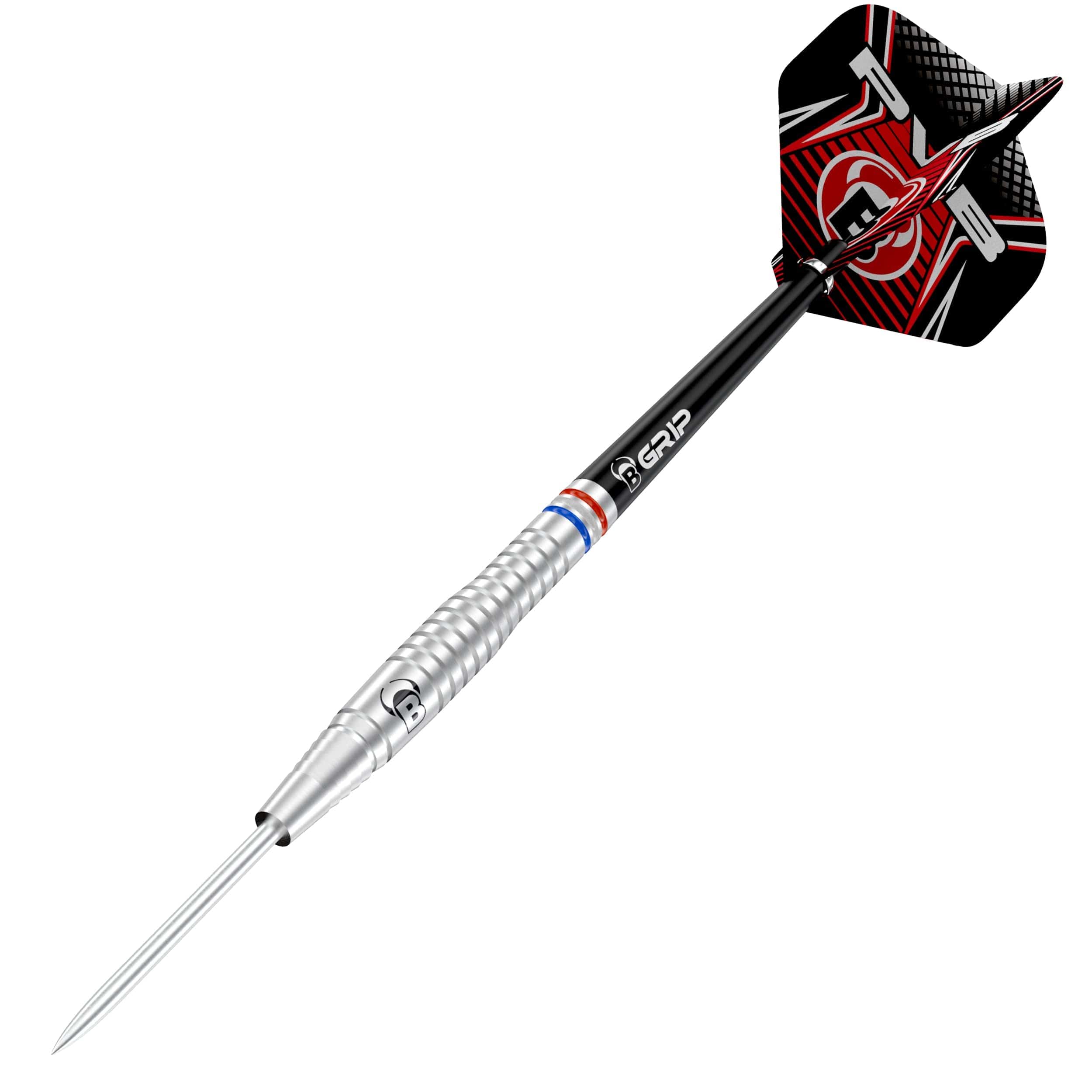 BULL'S Challenger Darts - Steel Tip - 90% Tungsten - Pim van Bijnen - 25g. The Challenger Dart is an exclusive reward for every BULL'S player who demonstrates exceptionalperformance. Made from high-quality 90% tungsten, this dart is ideal for supporting the development of ambitious players.Designed in close collaboration with Pim van Bijnen, the dart meets his individual preferences and requirements. Weighing 25g and featuring a distinctive tapered shape, the dart offers excellent balance. The ring grip in the middle section of the barrel provides optimal hold, while the shark grip at the front ensures additional grip and control.A standout feature is the final three rings at the rear of the barrel, which display the colorsof the Dutch flag, giving the dart a personal and unique appearance.