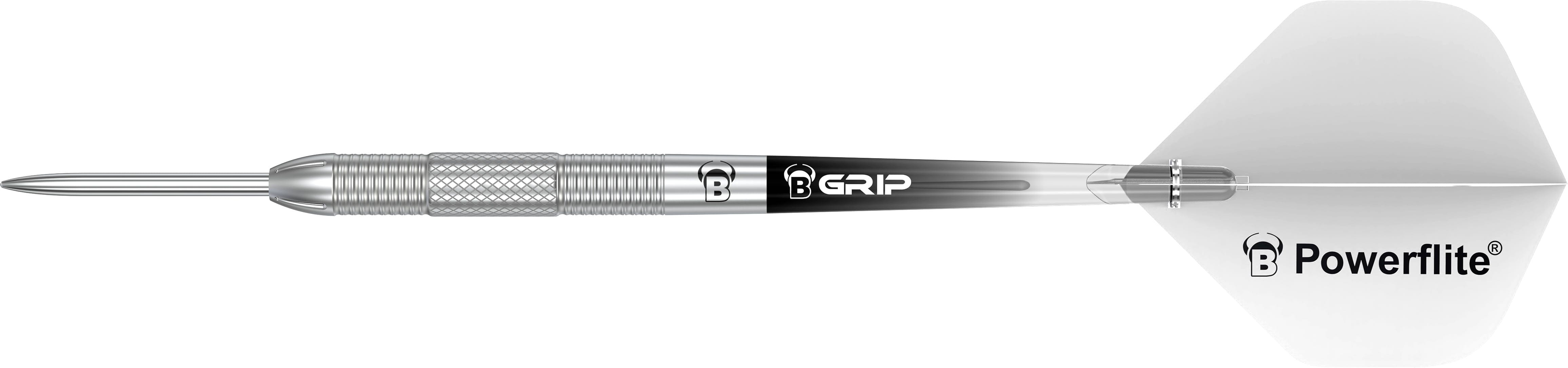 BULL'S Challenger Darts - Steel Tip - 90% Tungsten - Sascha Stuhlemmer - 23g. The Sascha Stuhlemmer Challenger Steel Dart is a true homage to classic dart design, crafted with precision from 90% tungsten and available in a 23g weight. This dart features a timeless lookand feel, divided into three distinct grip zones for optimal control and comfort.At both the front and rear of the barrel, you'll find a traditional ring grip that offers a simple yet proven grip pattern. The standout feature is the central section, which showcases a retro-inspired pineapple grip. This textured middle grip zone provides a light and comfortable feel in the handùperfect for consistent throws. Near the transition to the shaft, the barrel is laser-engraved with both the iconic BULL'S logo and Sascha Stuhlemmer's personal logo, adding a personal and professional touch. The setup is completed with a B-Grip2 TTC shaft and a classic white Powerflite, resulting in a clean, balanced dart ideal for players who appreciate traditional design with modernperformance.