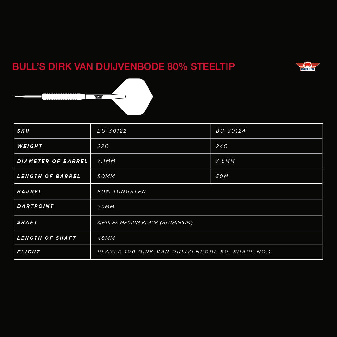 Bulls Dirk van Duijvenbode Darts - Steel Tip - 80% Tungsten - 24g . The Bull's Dirk van Duijvenbode 80% Darts represents the pinnacle of collaborative engineering between the renowned darts manufacturer and the player, Dirk van Duijvenbode. Constructed from 80% tungsten, these steel tip darts offer a superior balance. This stripped-down version of Dirk’s previous match dart delivers pure, balanced throwing bliss. The barrel features a specialized grip pattern tailored to Dirk's preferences, ensuring excellent control and comfort during every throw. These darts are designed to enhance your precision, allowing you to play with the same confidence as Dirk van Duijvenbode. This dart also comes with his own flight, the player 100 Dirk van Duijvenbode 80 No.2.