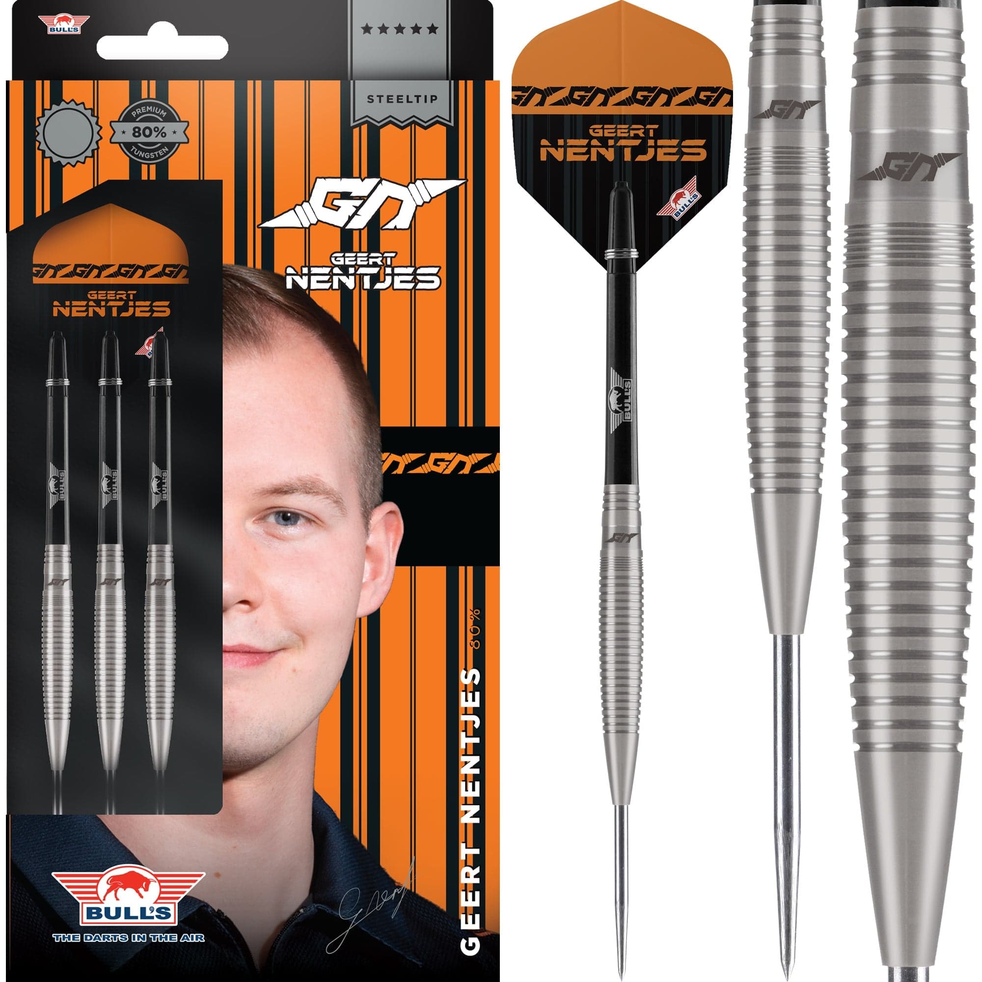 Bulls Geert Nentjes Darts - Steel Tip - 80% - Natural - 22g. These darts are constructed from 80% tungsten, ensuring durability and consistency in every throw. The unique feature of these darts is the Bull's Concord nose design, which ensures a smooth transition from point to barrel, reducing any drag and providing a seamless release.