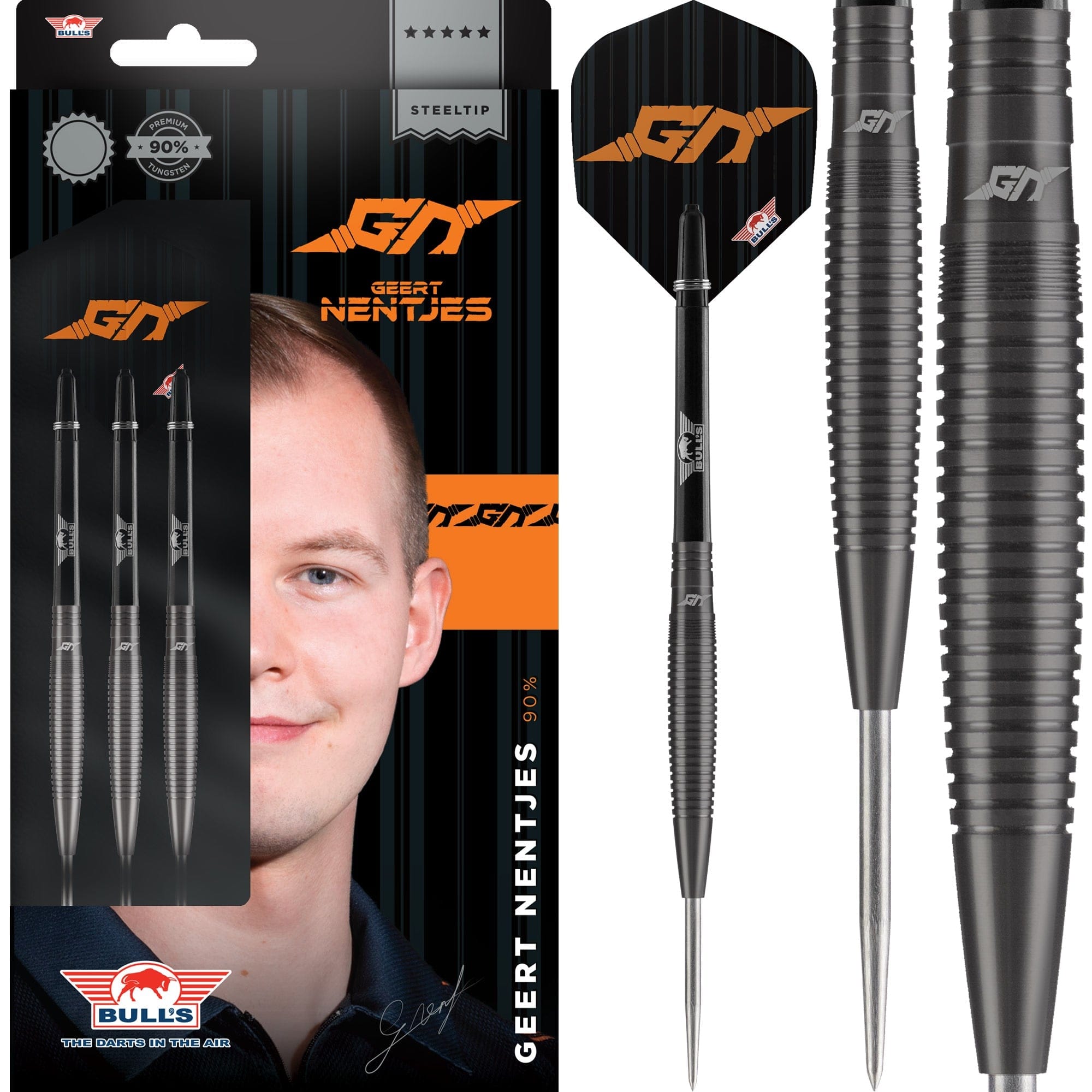 Bulls Geert Nentjes Darts - Steel Tip - 90% - Black Titanium - 23g. A highlight of these darts is the Bull's Concord nose design, ensuring a smooth and efficient transition from point to barrel. This meticulous design ensures minimal drag, granting players a smoother release and unparalleled control.