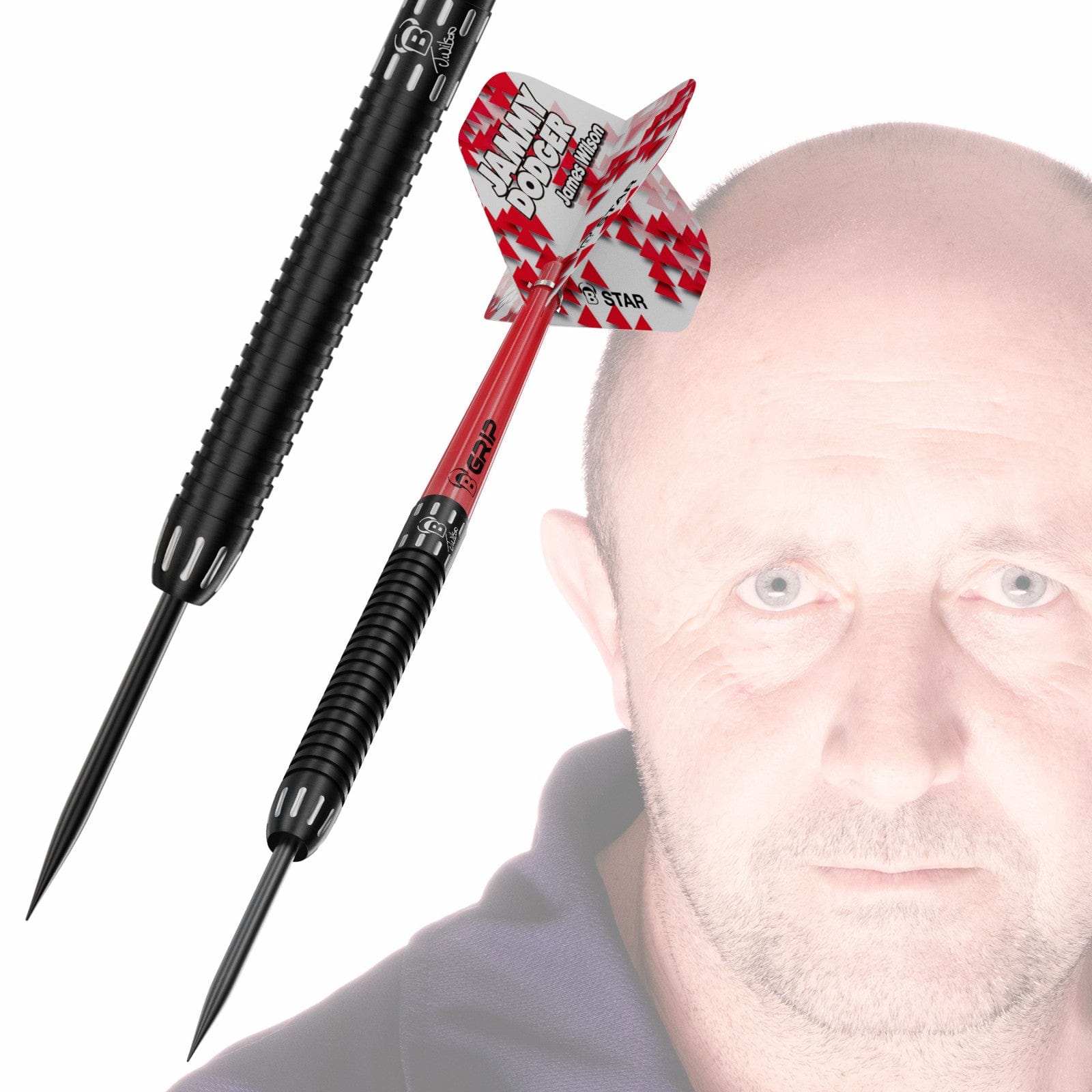 BULL'S James Wilson Darts - Steel Tip - 97% Tungsten - Jammy Dodger - 24g. James Wilson's Dart is made from the highest calibre 97% tungsten, and then contains a black titanium coating remachined with some milling detail. A black B-Grip-2 shaft as well as his B-Star flight complete the dart perfectly.