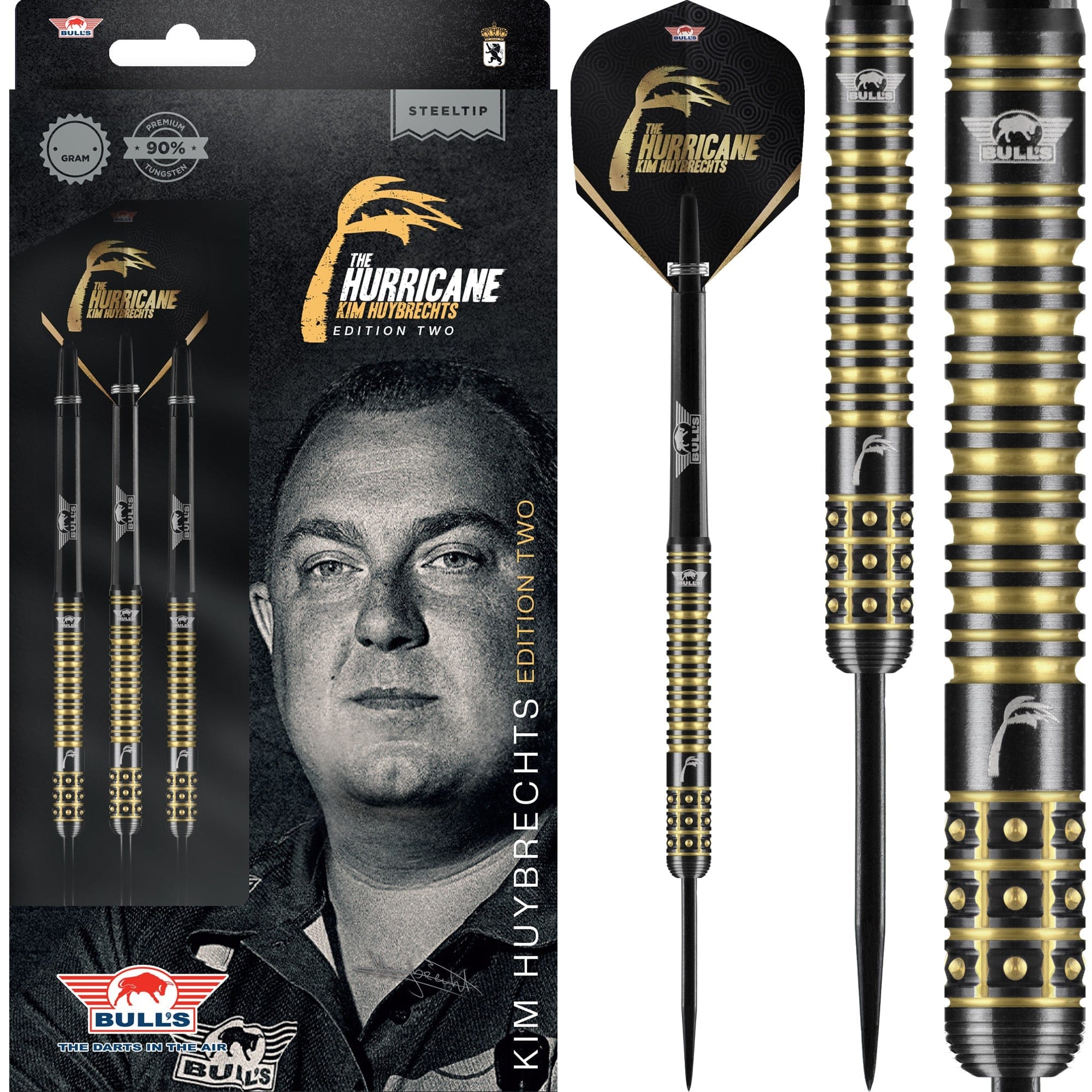 Bulls Kim Huybrechts Darts - Steel Tip - 90% - Black E2 - 23g. Each of these steeltip darts is crafted with 90% Tungsten, providing excellent balance and control. Unique Dart Grip: The dart grip of these darts is masterfully designed with ringed and incision elements, giving you ultimate control and stability with every throw. Black with Gold Accents: With a sleek black finish and subtle gold accents, these darts exude class and sophistication on the dartboard.