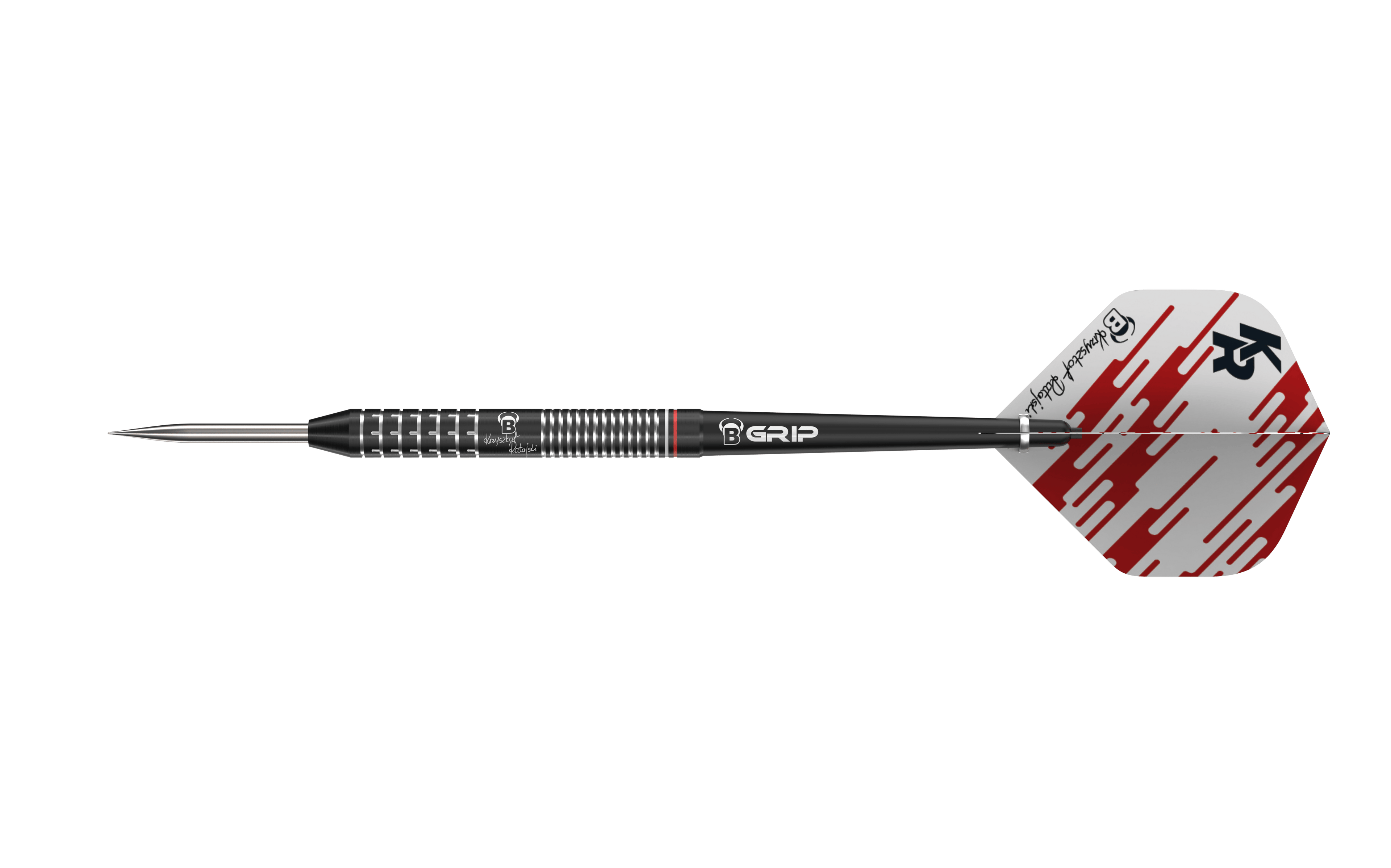 BULL'S Krysztof Ratajski Darts - Steel Tip - 90% Tungsten - Black - 22g. The second generation of Krzysztof Ratajski's original player dart, now available as the Black Edition, is made of 90% tungsten, just like the original, and is available in 22g, 24g, and 26g.The dimensions and design of his successful dart have been retained, with the Black Edition featuring a sleek, dark finish.The barrel has a tight ring grip at the top for maximum control, while the rings below his signature are spaced further apart to provide an optimal grip feel. The flights are designed to Ratajski's specifications in white and red, featuring his initials.