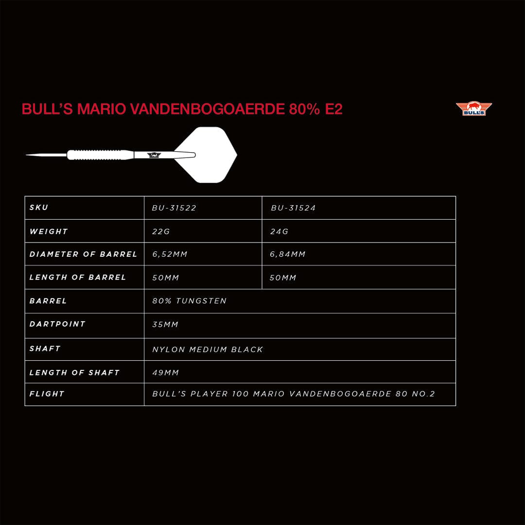 Bulls Mario Vandenbogaerde Darts - Steel Tip - 80% Tungsten - 22g. The Bull’s Mario Vandenbogaerde 80% Darts. This dart is specifically designed to meet the high demands of a professional dart player. Experience the perfect blend of precision, durability, and style with Mario Vandenbogaerde latest dart. Each set contains 80% Tungsten barrels, shafts and flights. Thread: 2ba