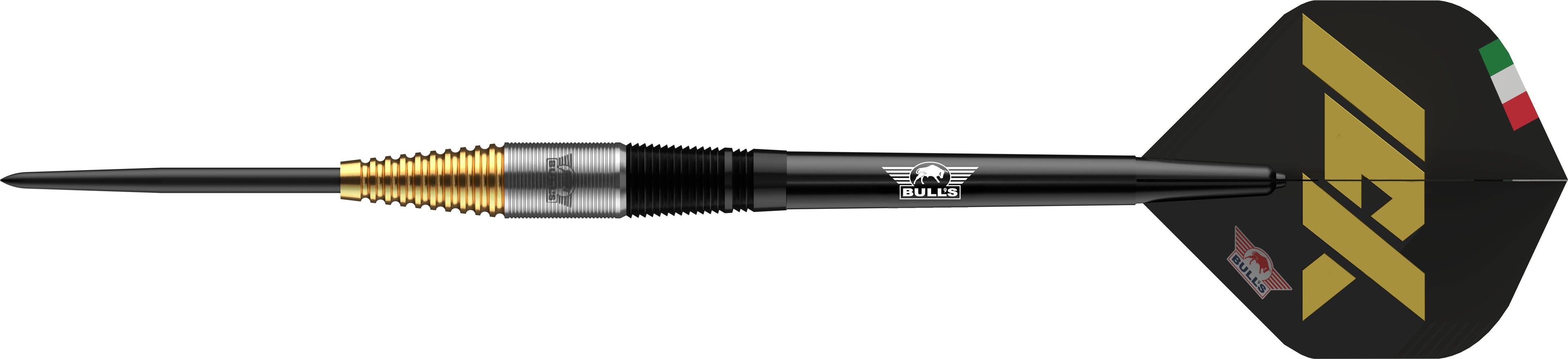 Bulls Massimo Dalla-Rosa Darts - Steel Tip - 90% Tungsten - 20g. This dart is specifically designed to meet the high demands of our new Italian dart player Massimo Dalla-Rosa. Experience the perfect blend of precision, durability, and style with Massimo Dalla-Rosa latest dart. Made from 90% Tungsten, this dart offers exceptional durability and slim profile. The high tungsten content ensures a narrow barrel, allowing you to group your darts closer together for higher scores. The Massimo Dalla-Rosa 90% is a short torpedo shaped barrel. The grip is varies over the whole barrel. In the front there is normal ringed grip, in the middle you can see a micro ringed grip and in the back of the barrel you see shark grip. The barrel is finished off with gold, black and silver. This dart also comes with his own personalized flight the “Player 100 Massimo Dalla-Rosa 90 No2.”which is separately available.