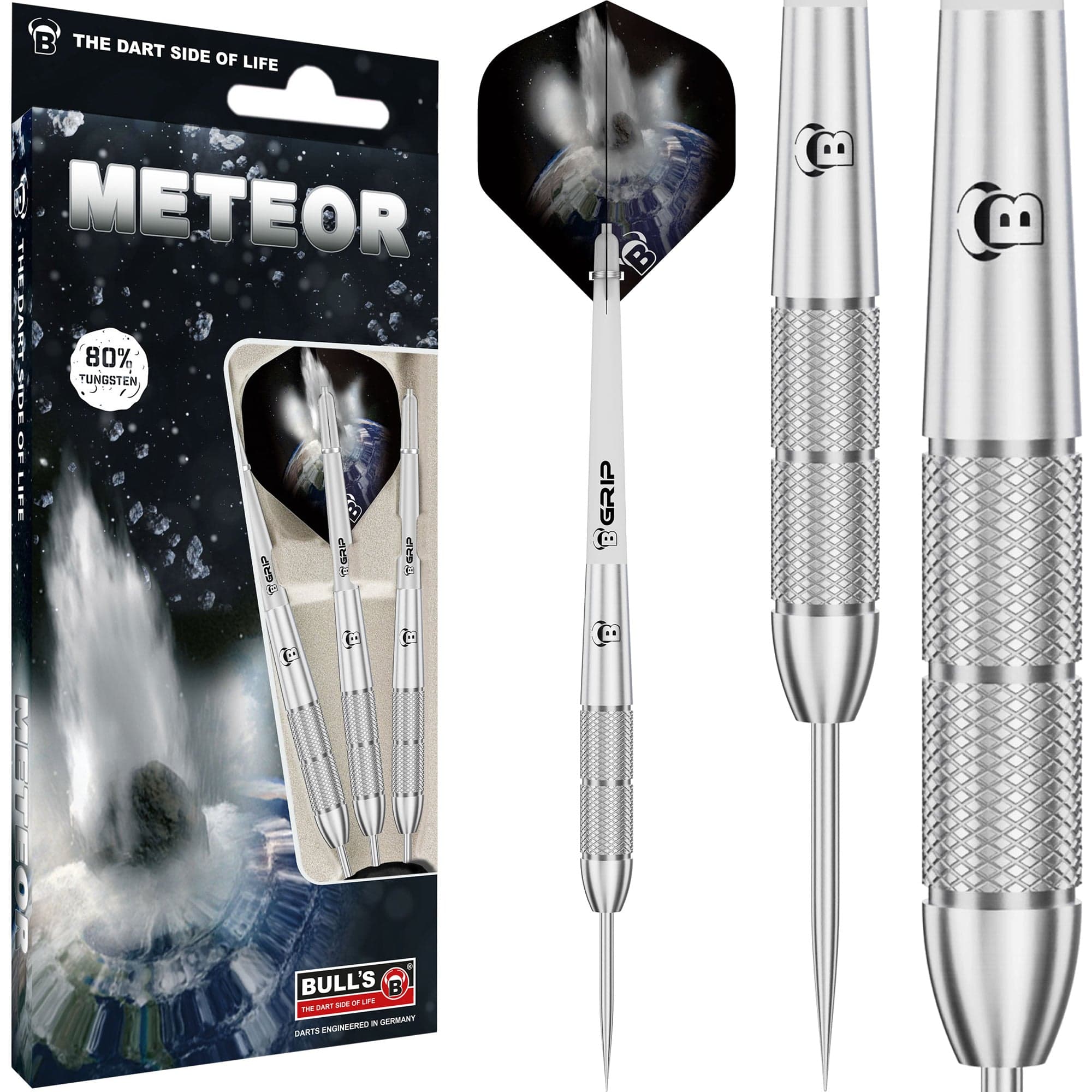 BULL'S Meteor Darts - Steel Tip - 80% Tungsten - MT13 - Torpedo Knurl - 29g. This Bulls Meteor Dart is made from 80% Tungsten and features a selection of grip types with different weights through the range. The MT13 is a torpedo shaped barrel with a knurled grip along the front section. A B-Grip-2 shaft as well as Bulls flights complete the dart perfectly.
