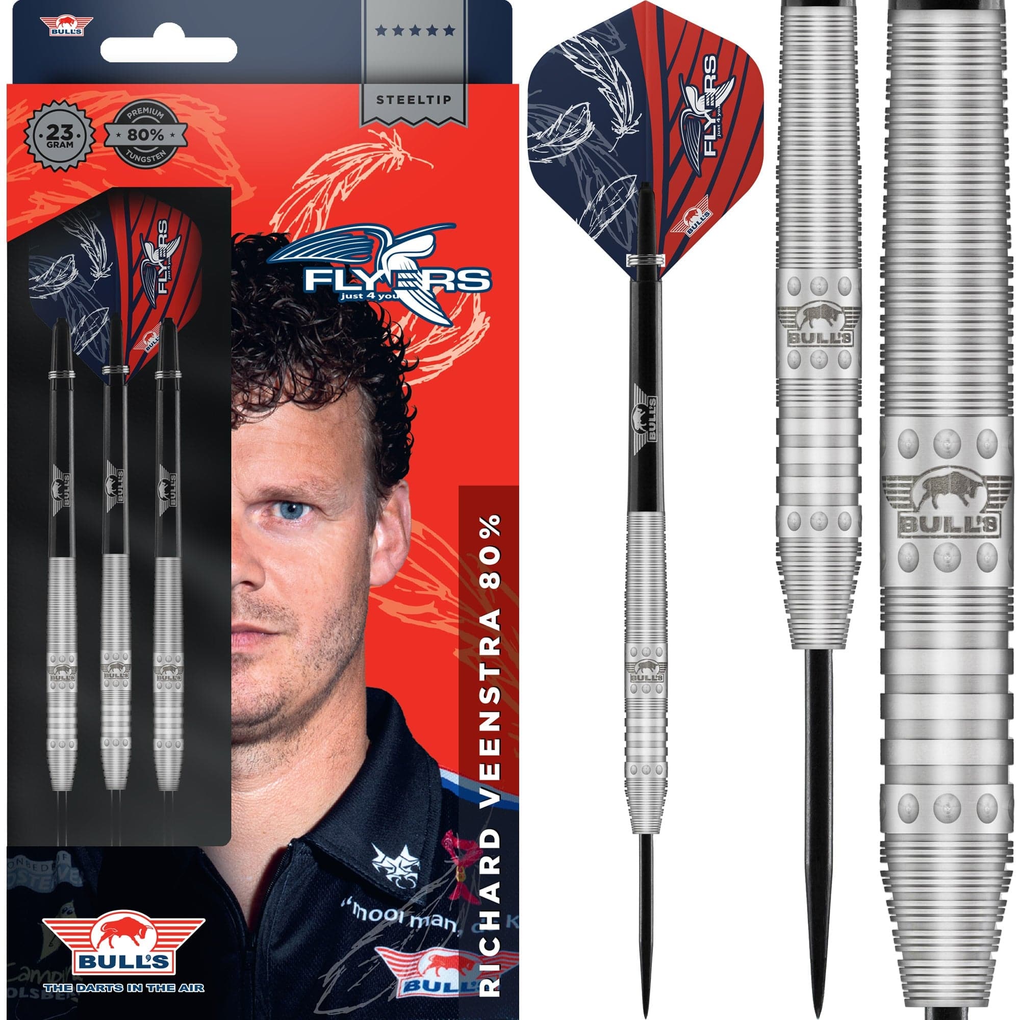 Bulls Richard Veenstra Darts - Steel Tip - 80% - Natural - 23g. These darts are made from 80% tungsten which provides durability and a consistent throwing experience. They feature a rugged grip at both the front and rear, making them versatile for players of all skill levels. The darts also have engraved dots to indicate the primary grip zone, facilitating improved hold and accuracy.