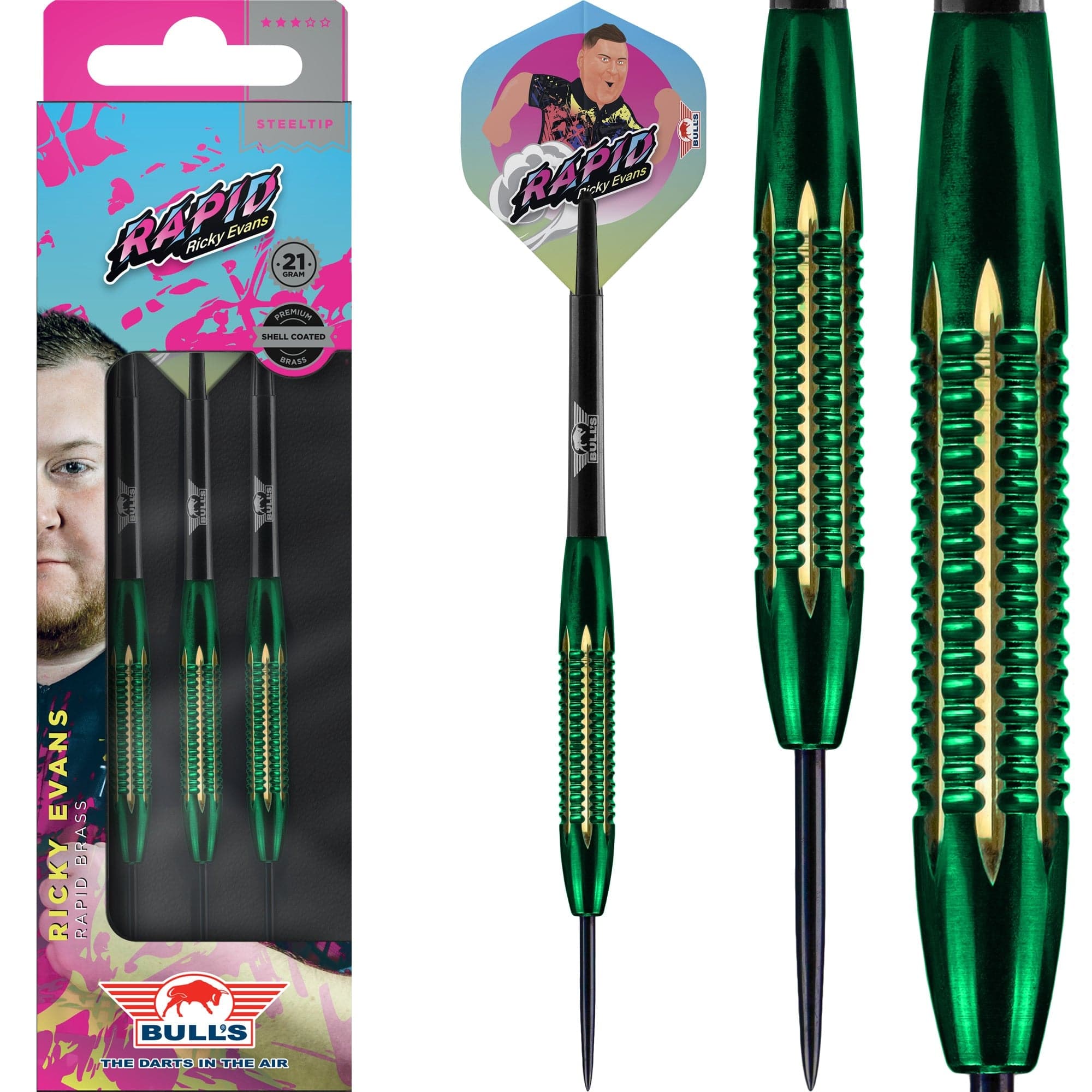 Bulls Ricky Evans Darts - Steel Tip - Shell Coated Brass - Rapid - Green - 21g. These uniquely green-coated brass darts exude quality and style, perfectly capturing the flair of Ricky Evans himself. They come with black medium shafts and striking Ricky Evans dart flights. Ricky is known for his fast playing style and his vibrant personality on stage.
