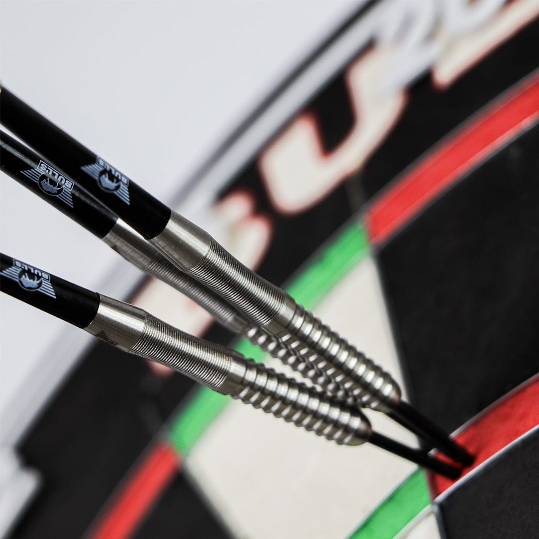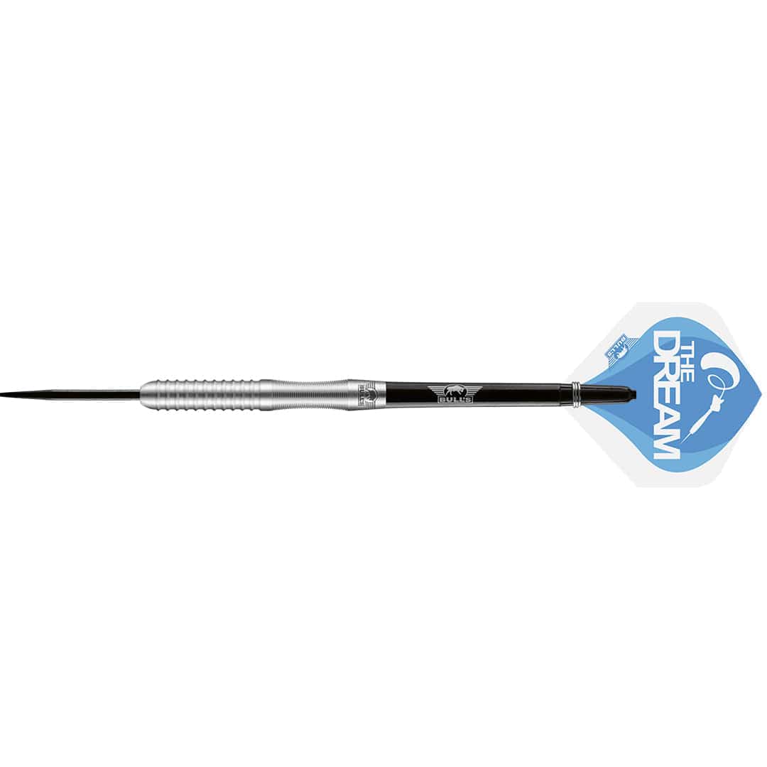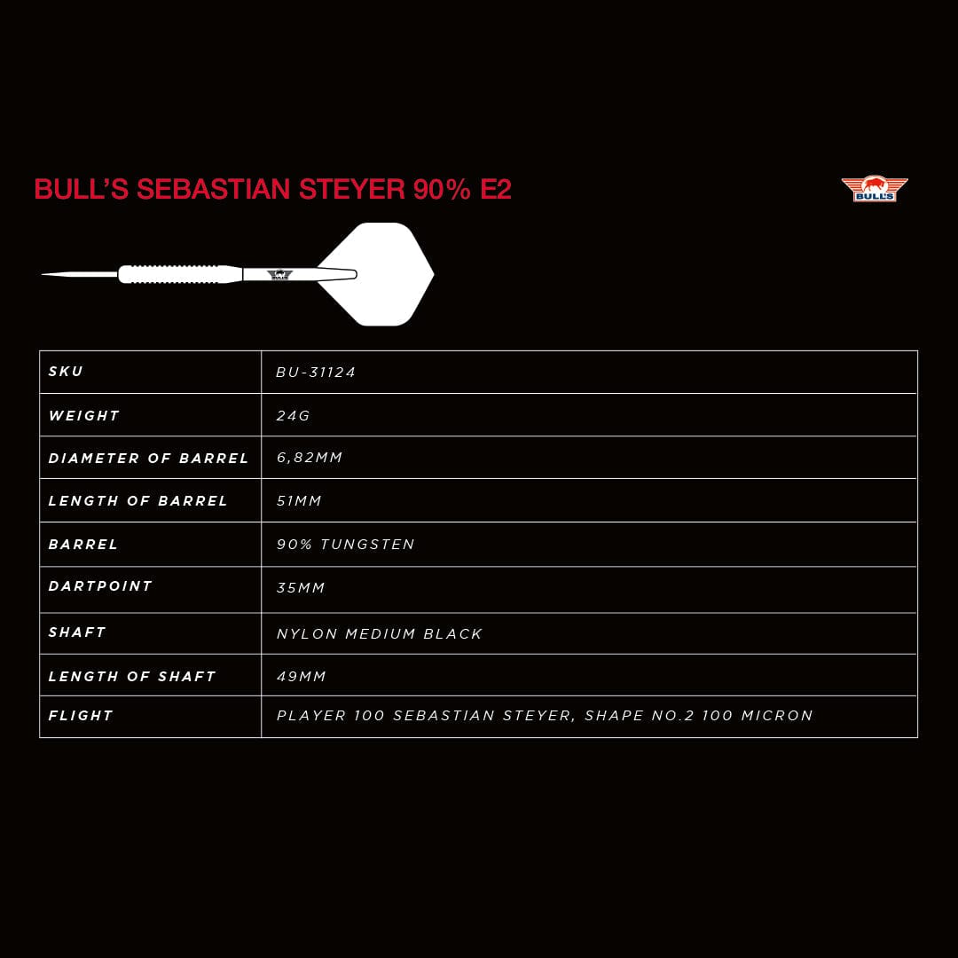 Bulls Sebastian Steyer E2 Darts - Steel Tip - 90% Tungsten - 24g. The Bull’s Sebastian Steyer Edition 2 90% Darts. This dart is specifically designed to meet the high demands of professional dart players. Experience the perfect blend of precision, durability, and style with Sebastian Steyer's latest dart. Each set contains 90% Tungsten barrels, shafts and flights. Thread: 2ba