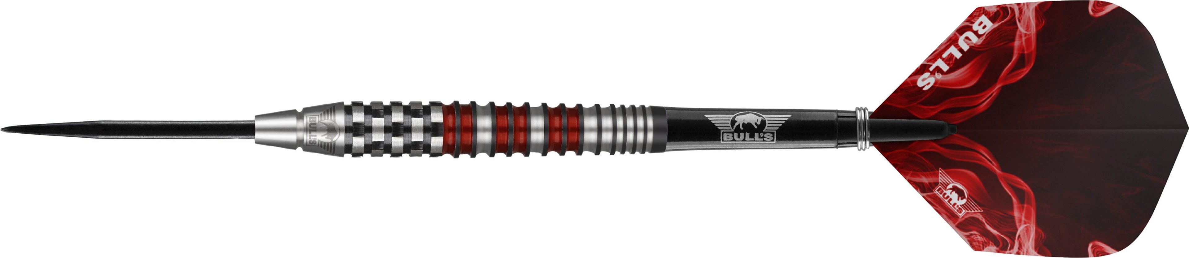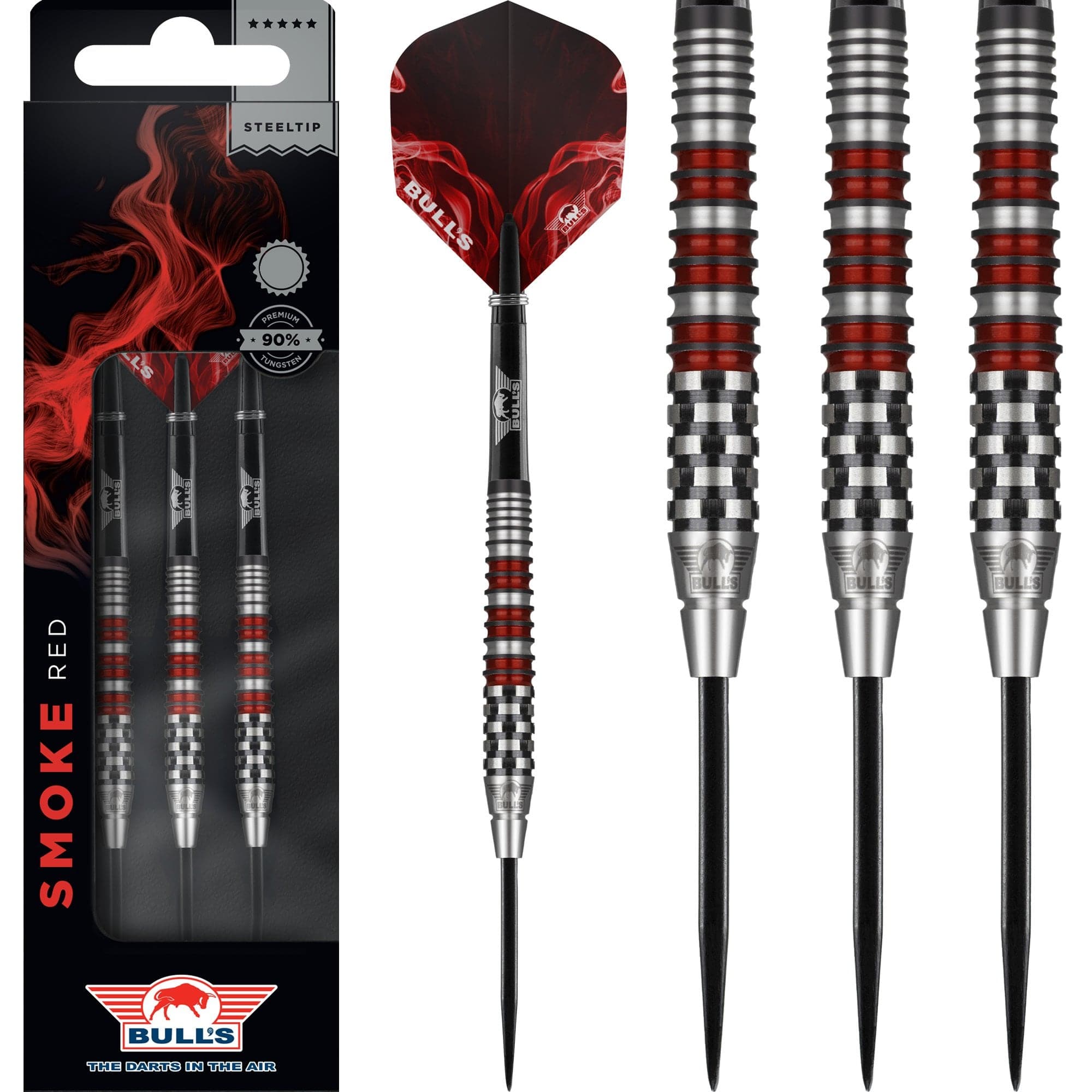 Bulls Smoke 90% Tungsten Steel Tip Darts. Each pack contains Bulls Shafts, Bulls Powerflite Flights, and a Slim Case. Bulls Smoke Darts - Steel Tip - Style A - Ringed - Black and Red