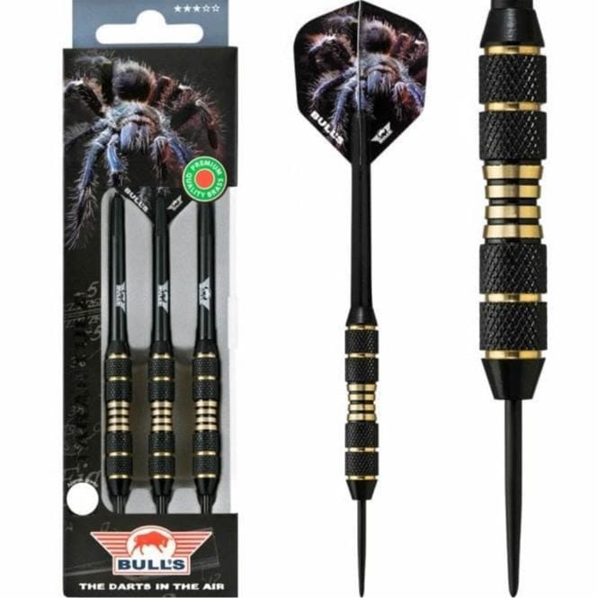 Bulls Tarantula Brass Steel Tip Darts. Hi Quality brass steeltip darts for beginners. Each pack contains Shafts, Flights, and a Slim Case. Bulls Tarantula Darts - Steel Tip Brass - Twin Knurl