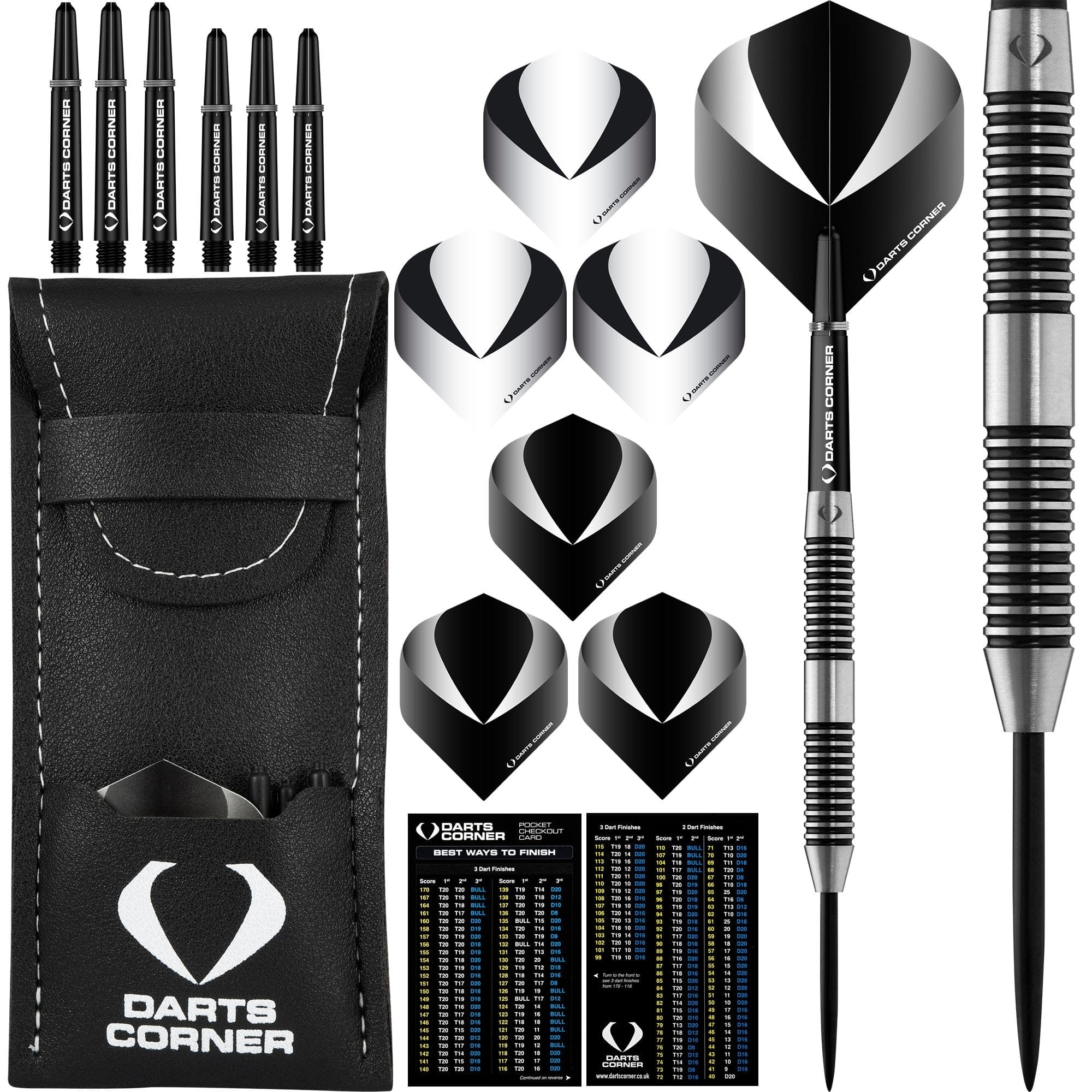 Darts Corner Warfare 80% Steel Tip Darts - M1 Black Ringed. Quality 80% Tungsten Darts. Includes: 2 Sets of Darts Corner Flights, 2 Set of Nylon Shafts with springs, Point Protector, Darts Corner Bar Wallet, Checkout Card. Darts Corner Warfare Darts - Steel Tip - M5 - Black Ring - 23g-D0628