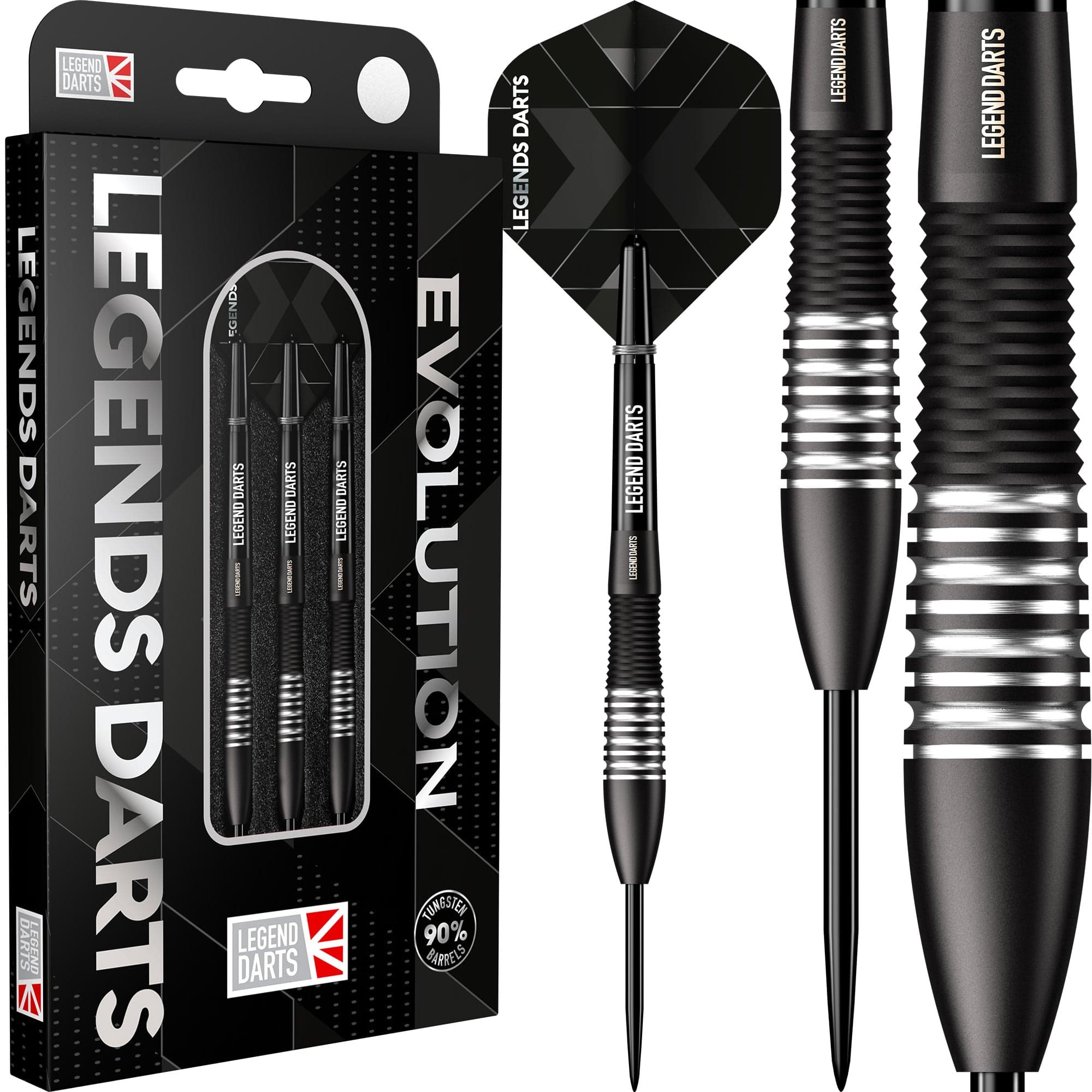 Legend Darts - Steel Tip - Revolution Series - B05 - Black - Bullet Shark - 22g. This 90% Tungsten barrel from Legend Darts features a black titanium coating with its uniquely created barrel design, and comes complete with a set of Legend Flights and Shafts.