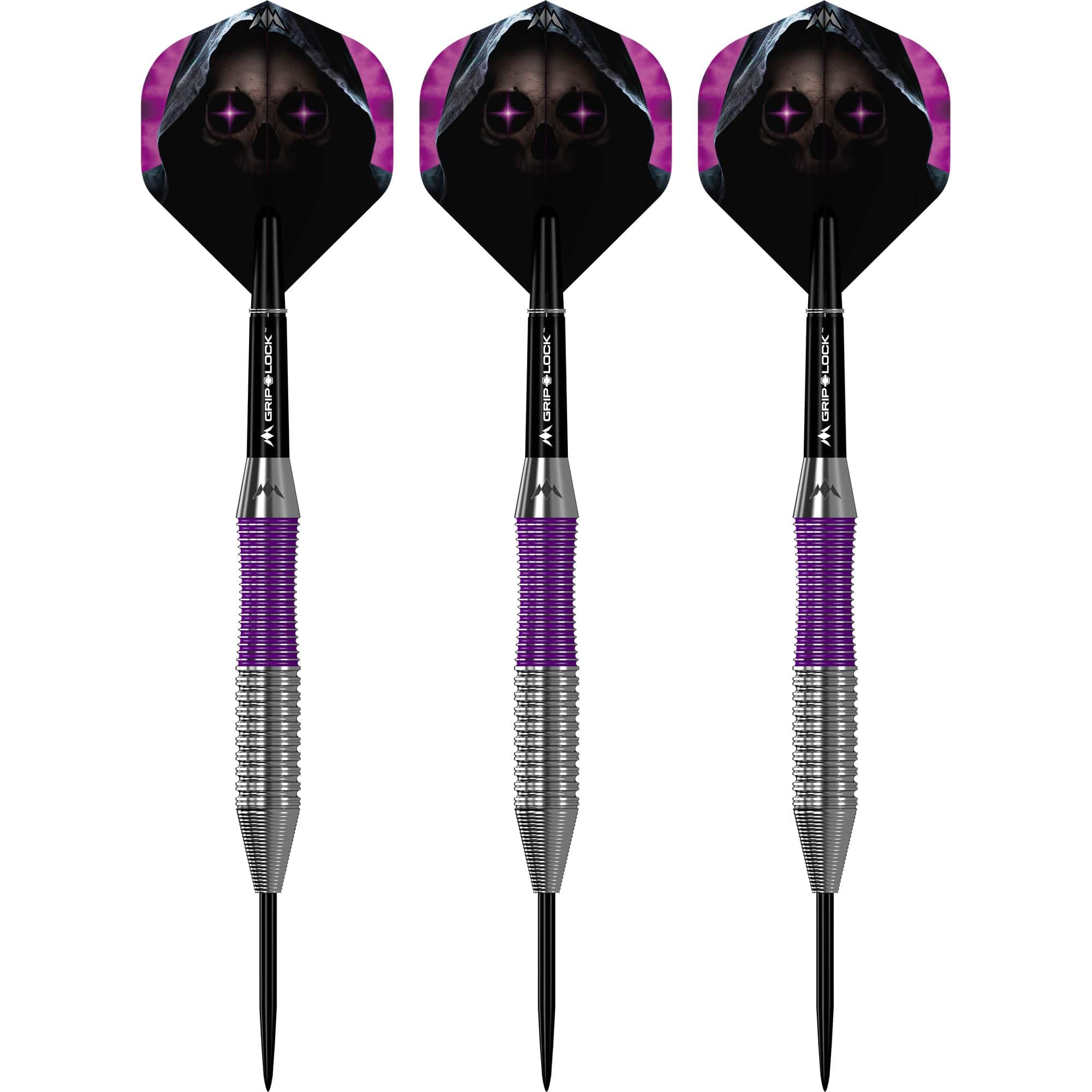 Mission Phantom Darts - Steel Tip - Silver & Purple Brass - 22g. Take your game to frightening new levels with the Mission Phantom Darts. Made from brass and featuring a silver coating on the barrels, the Phantom dart includes a central scallop ring grip section with purple painted rings. The smooth rear section of the barrel has a laser-etched Mission logo, with a ring grip front section that tapers naturally into a tapered nose with fine ring grip.
