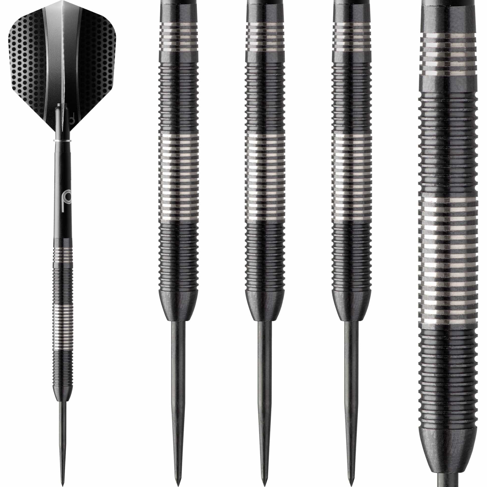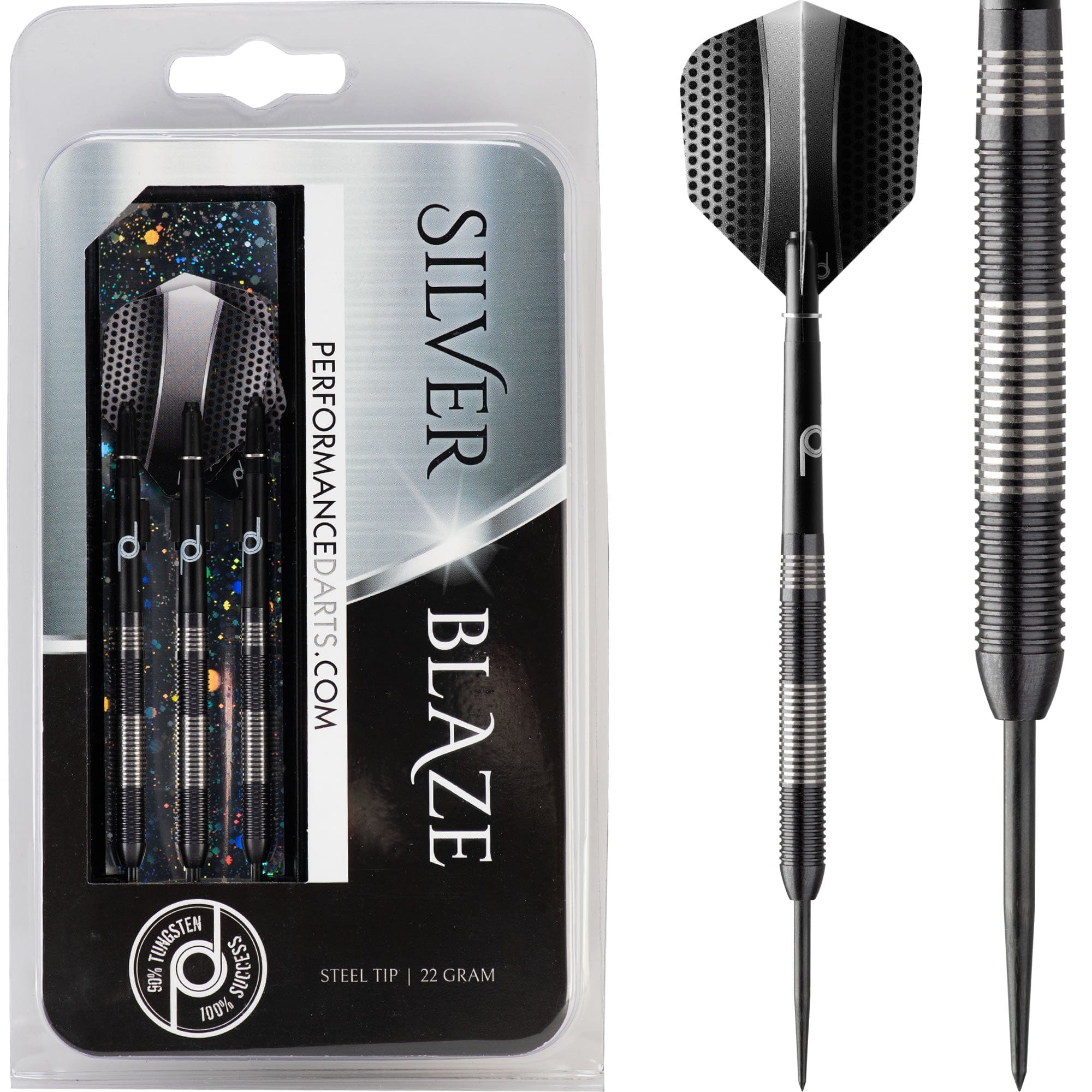 Performance Darts - Silver Blaze - Steel Tip - Black & Silver - 24g. These dual colour 90% Tungsten black titanium coated barrels have been remachined to split the black and silver colour on the barrel to create this unique look. These ringed barrels look simply stunning. Each set comes complete with a set of nylon shafts and a set of Performance flights.