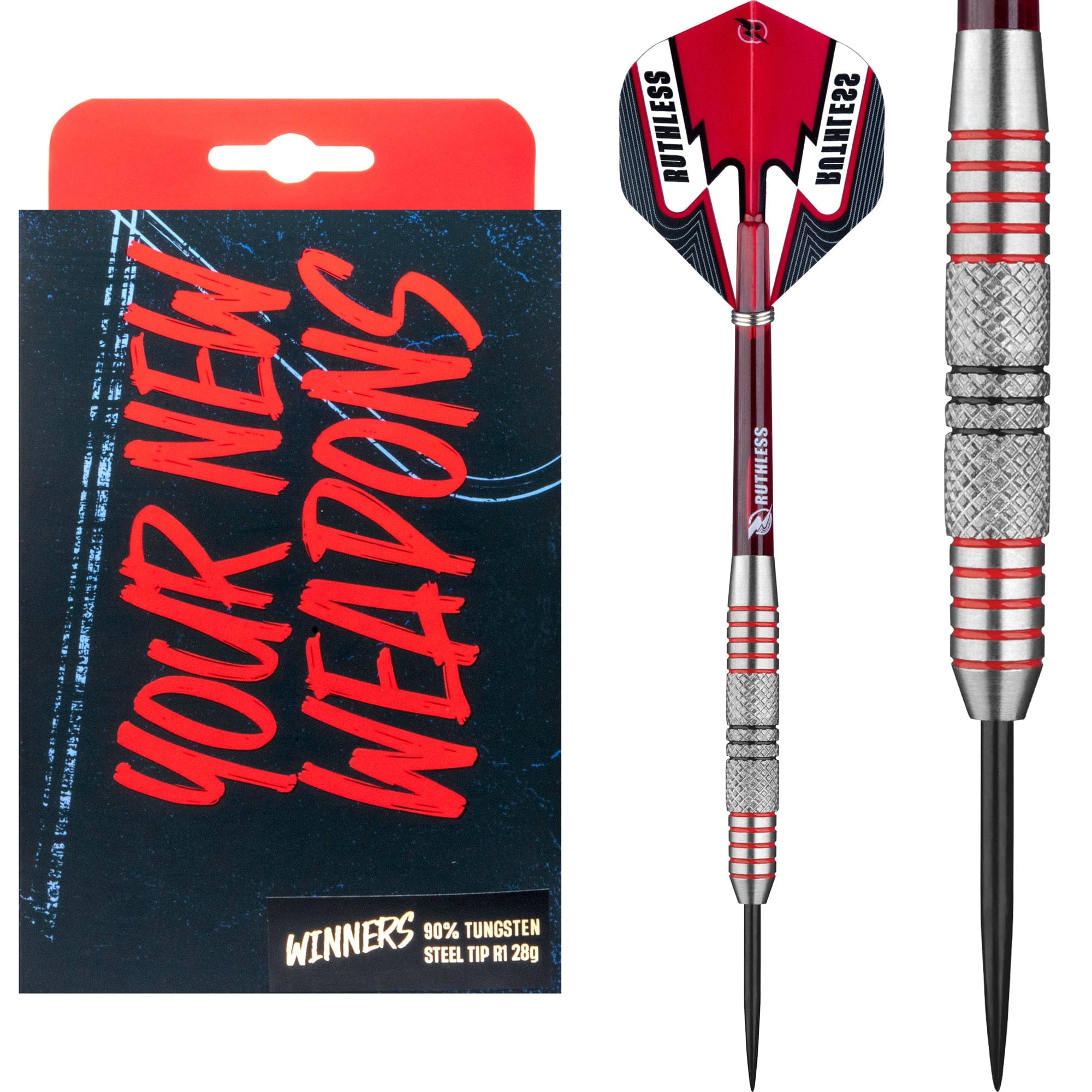 Welcome to the podium with Ruthless Winners Darts. This is the dart for those who know nothing but first place. Mighty 90% Steel Tip Tungsten. Sturdy Ruthless Flights. No Nonsense! Featuring intense red and black accents throughout, this dart is a menace for all opponents! Grip Rating 4/10. Also available in Ringed. Ruthless Winners 90% Steel Tip Tungsten Darts. Features: 90% Tungsten, Durable Nylon Shafts, Ruthless Flights. Ruthless Winners Darts - Steel Tip - Centre Knurl - Black & Red - 28g