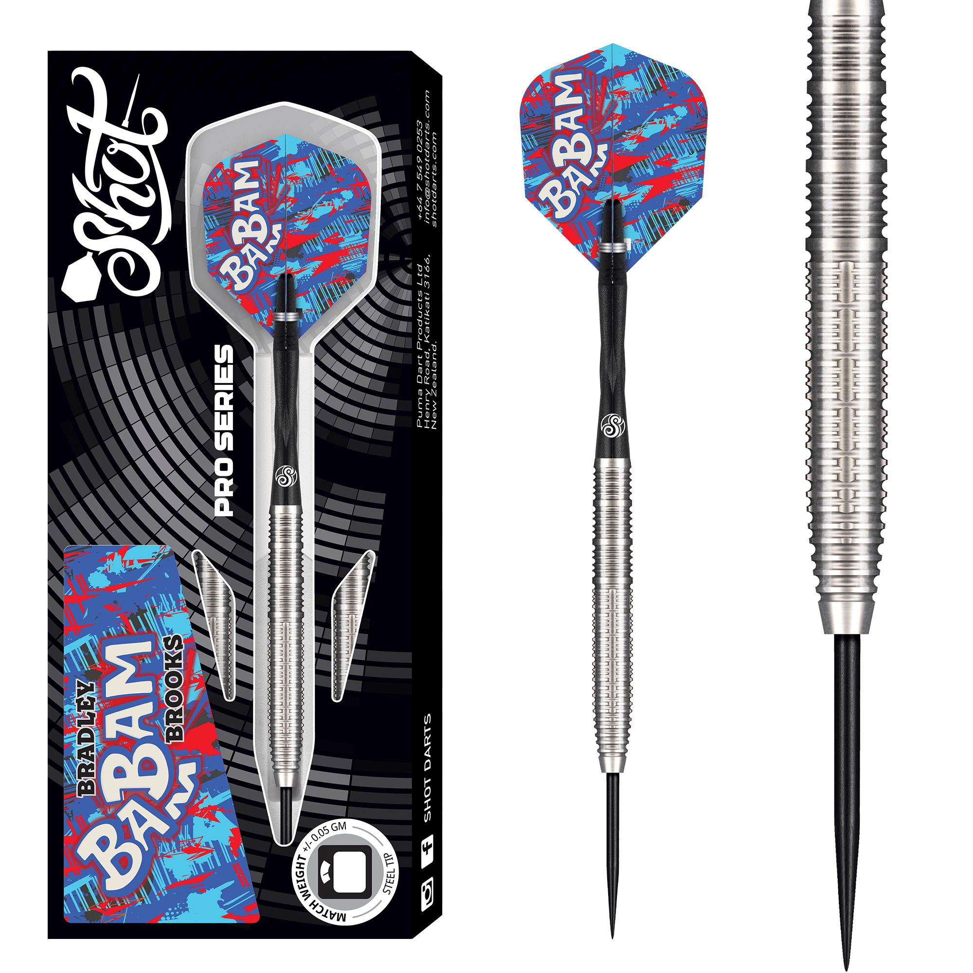 Shot Bradley Brooks Darts - Steel Tip - 90% Tungsten - Gen 2 - 23g. Designed in collaboration with Bradley Brooks, the Gen 2 offers a variation on his match dart. A refined evolution, built for broader appeal and perfectly balanced in the centre, this missile shape works to stabilise the dart in the air. Grippy rings in the rear offer a rock-solid push point. Featuring a raw tungsten finish and a high 4/5 grip level, this is a true player’s barrel—built for consistency, control, and confident throws under pressure.