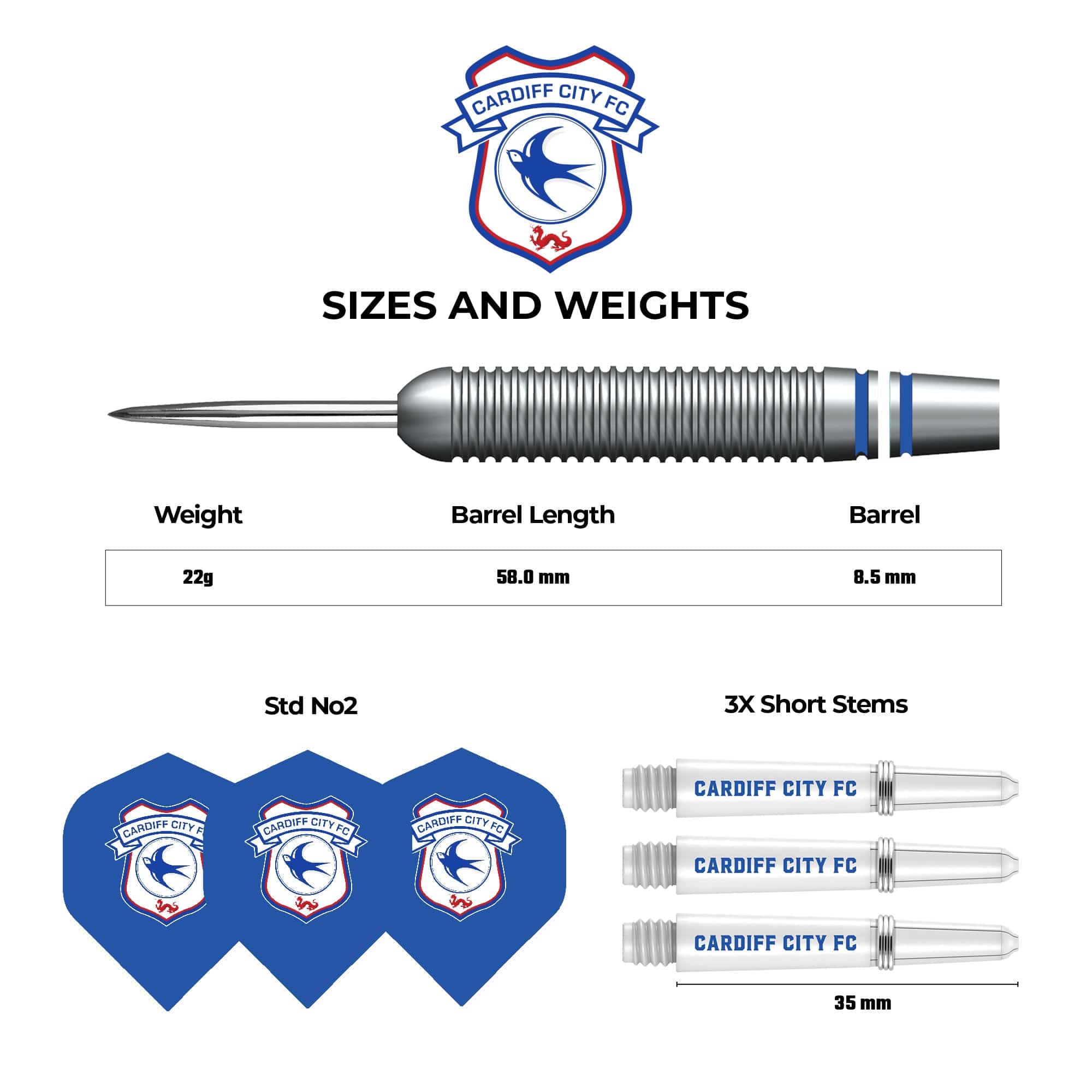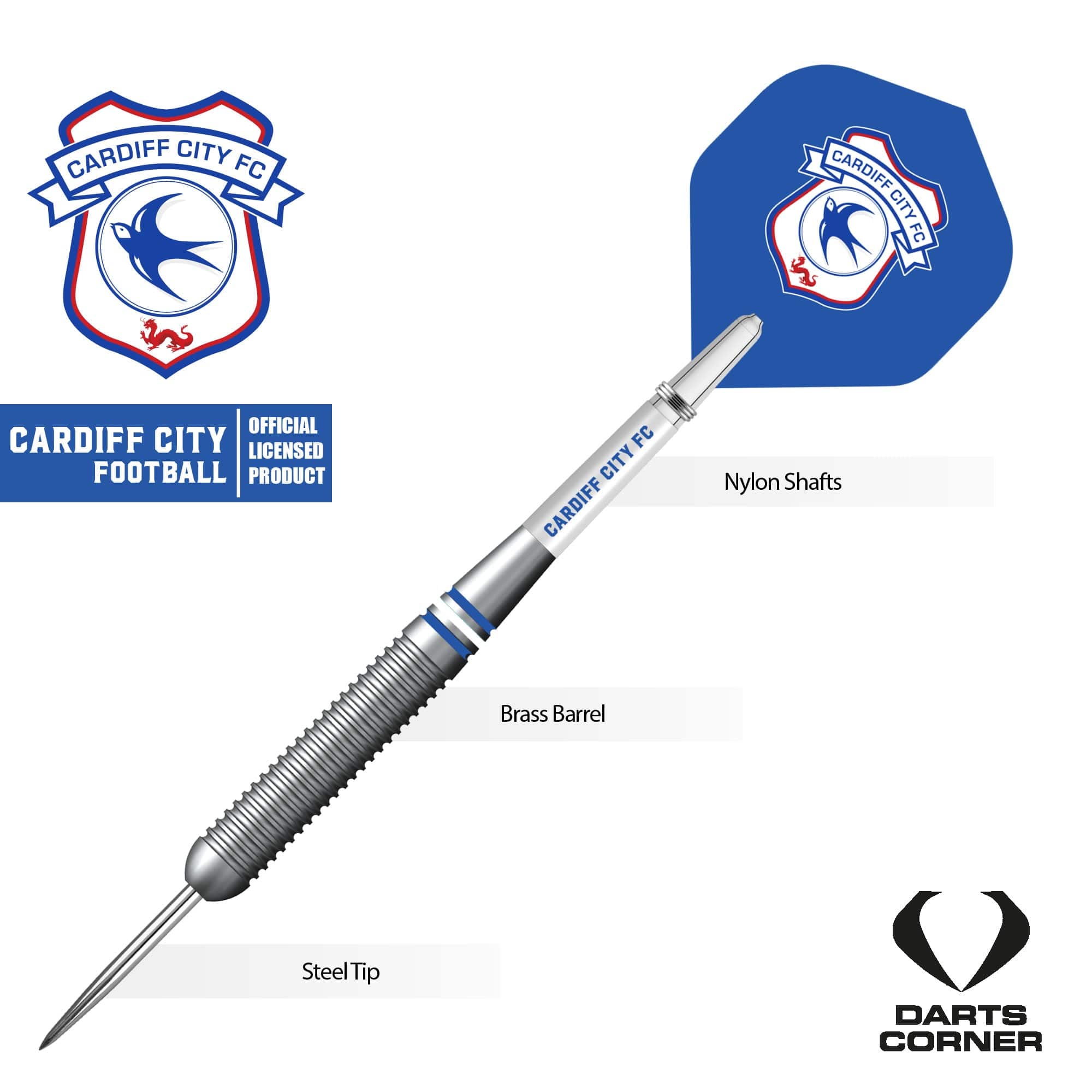 Cardiff City Football Club Steel Tip Darts - Coated Brass. Includes: Coated Brass Barrels, Cardiff City Flights, 1 Set of Nylon Shafts with rings, Point Protector, Bar Wallet. Official Licensed Cardiff City Football Club Darts - Steel Tip Brass - Official Licensed -CCFootball Club - 22g