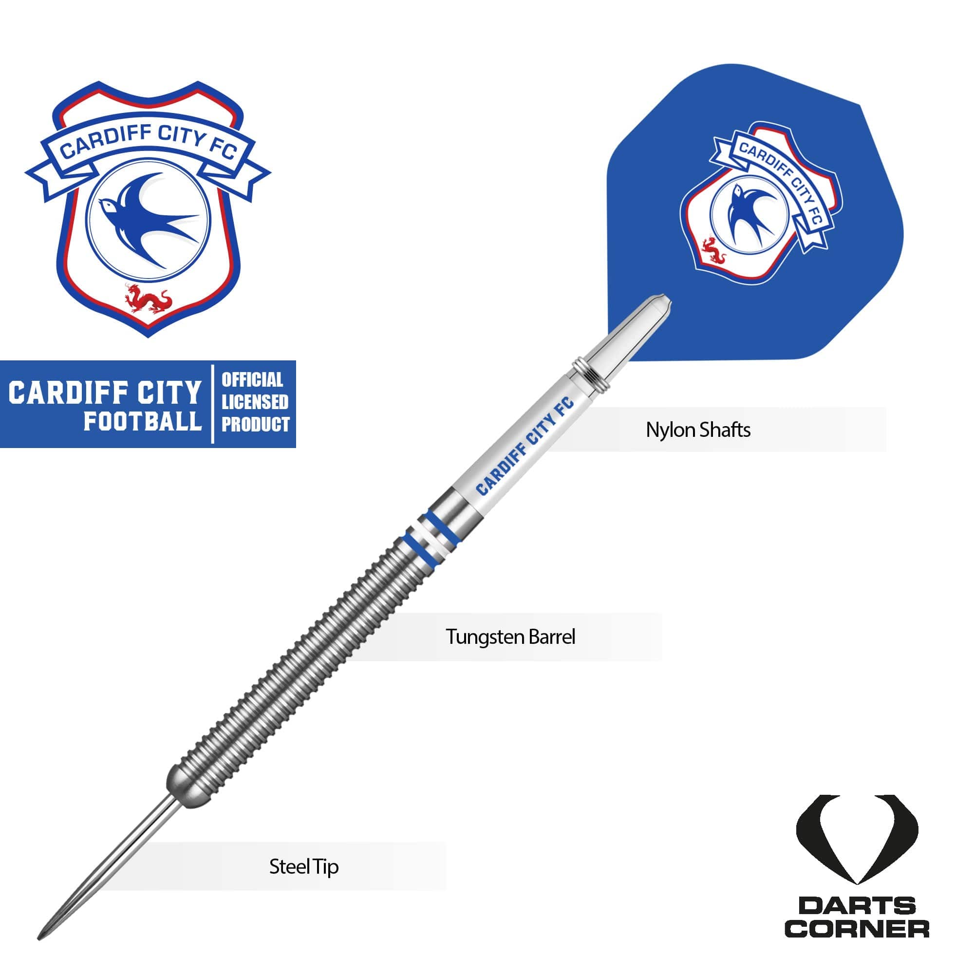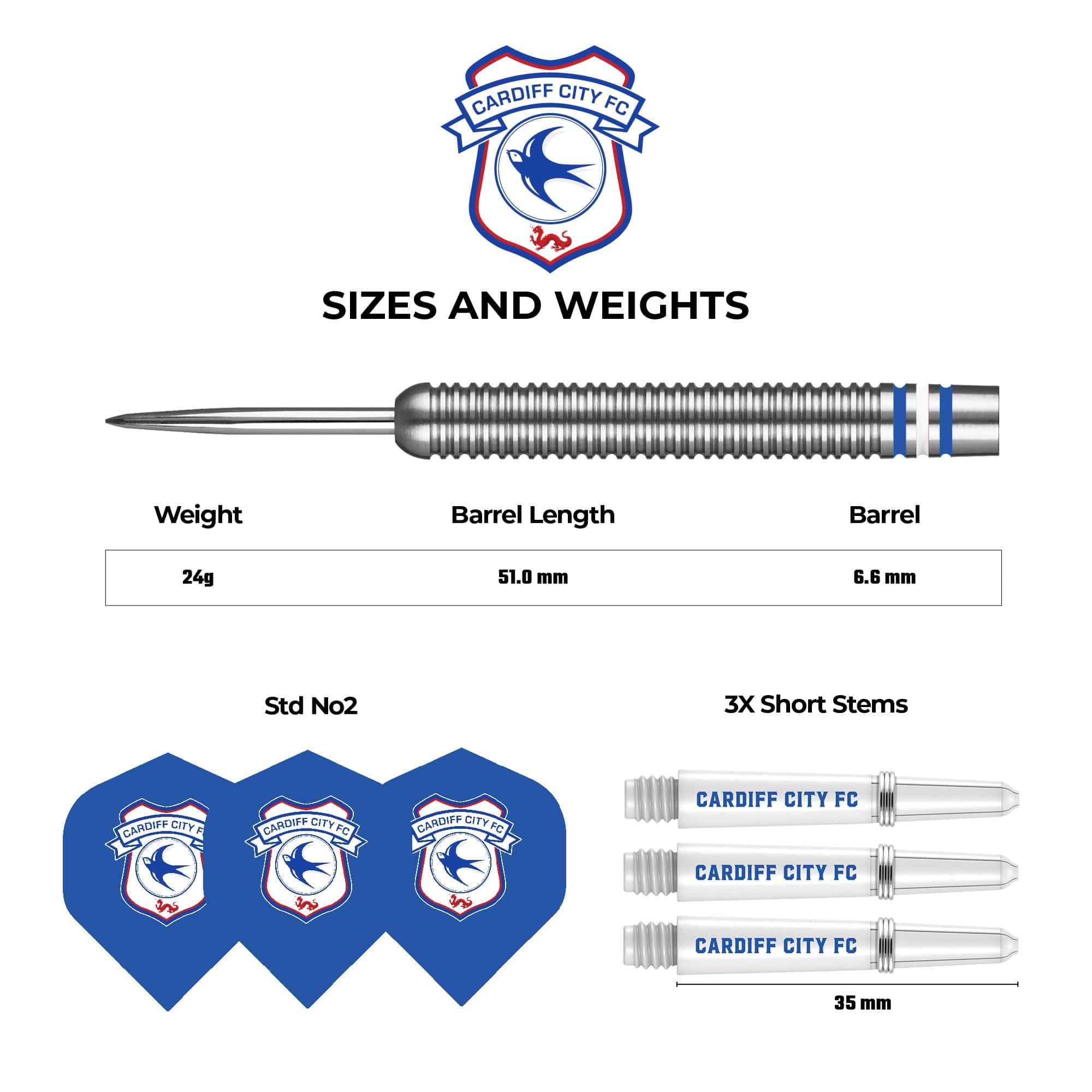 Cardiff City Football Club Steel Tip Darts - Tungsten - 24G Includes: Coated Brass Barrels, Cardiff City Flights, 1 Set of Nylon Shafts with rings, Point Protector, Bar Wallet. Official Licensed Cardiff City Football Club Darts - Steel Tip Brass - Official Licensed -CCFootball Club - 22g