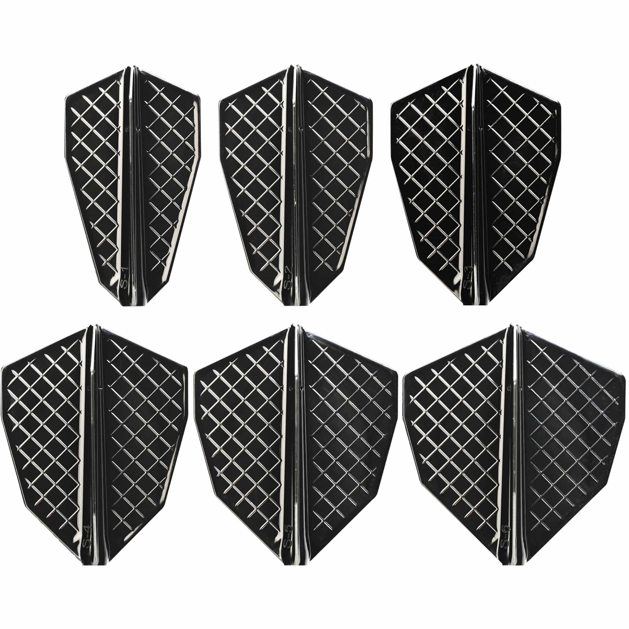 Cosmo Fit Flight Pro - S-Series - S-6 in black. The Fit Flight Pro is the most innovative Flight and Shaft System. Common Flight Shapes are installed by pushing the full flight system onto the shaft, creating a complete unit. These black S-Series flights are loosely based on a fantail shape flight, in varying widths. Only to be used with Cosmo Fit Shafts.
