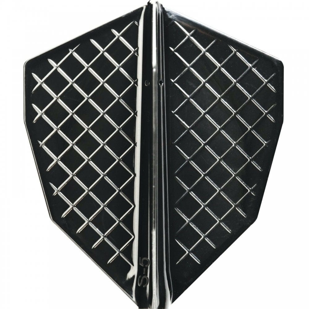 Cosmo Fit Flight Pro - S-Series - S-5 in black. The Fit Flight Pro is the most innovative Flight and Shaft System. Common Flight Shapes are installed by pushing the full flight system onto the shaft, creating a complete unit. These black S-Series flights are loosely based on a fantail shape flight, in varying widths. Only to be used with Cosmo Fit Shafts.