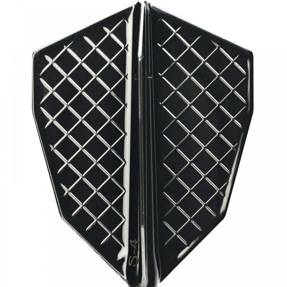 Cosmo Fit Flight Pro - S-Series - S-4 in black. The Fit Flight Pro is the most innovative Flight and Shaft System. Common Flight Shapes are installed by pushing the full flight system onto the shaft, creating a complete unit. These black S-Series flights are loosely based on a fantail shape flight, in varying widths. Only to be used with Cosmo Fit Shafts.