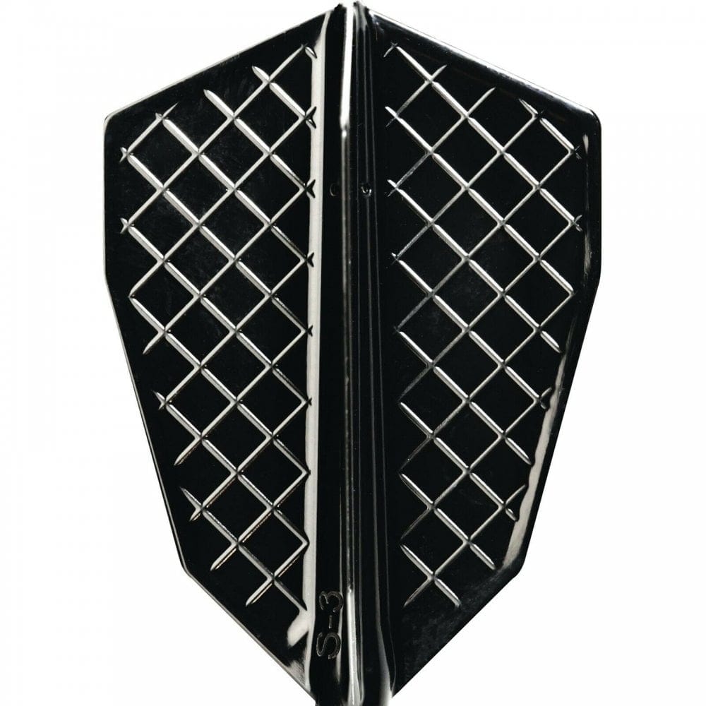 Cosmo Fit Flight Pro - S-Series - S-3 in black. The Fit Flight Pro is the most innovative Flight and Shaft System. Common Flight Shapes are installed by pushing the full flight system onto the shaft, creating a complete unit. These black S-Series flights are loosely based on a fantail shape flight, in varying widths. Only to be used with Cosmo Fit Shafts.