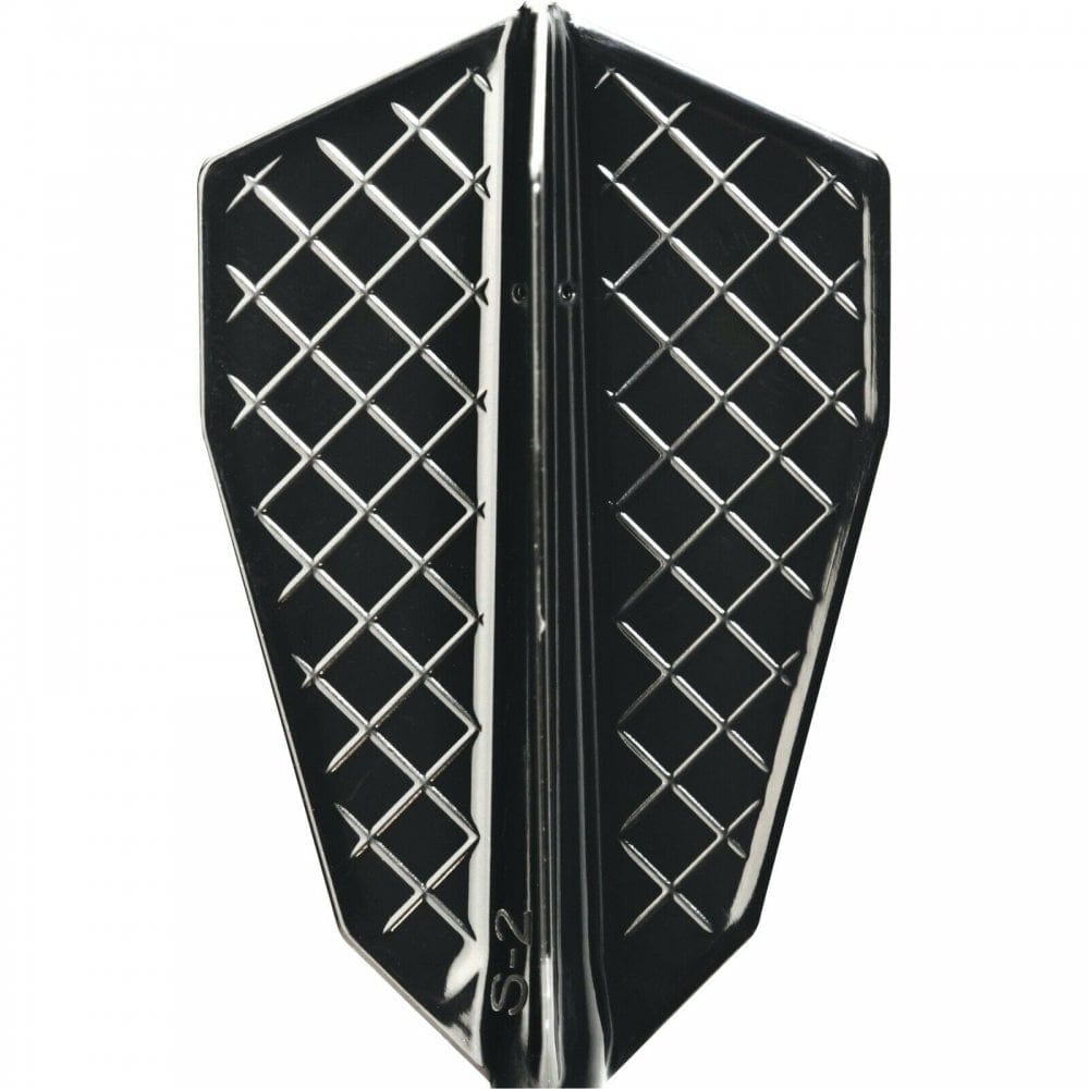 Cosmo Fit Flight Pro - S-Series - S-2 in black. The Fit Flight Pro is the most innovative Flight and Shaft System. Common Flight Shapes are installed by pushing the full flight system onto the shaft, creating a complete unit. These black S-Series flights are loosely based on a fantail shape flight, in varying widths. Only to be used with Cosmo Fit Shafts.