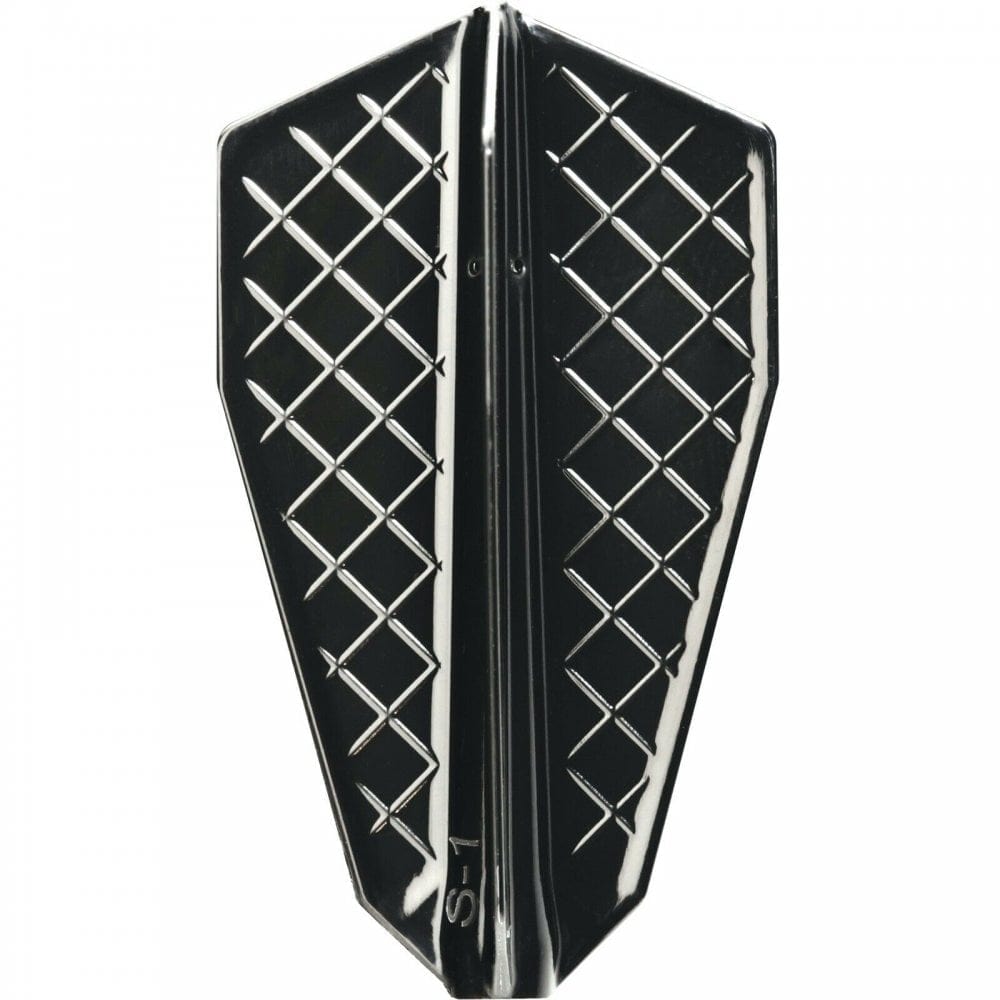 Cosmo Fit Flight Pro - S-Series - S-1 in black. The Fit Flight Pro is the most innovative Flight and Shaft System. Common Flight Shapes are installed by pushing the full flight system onto the shaft, creating a complete unit. These black S-Series flights are loosely based on a fantail shape flight, in varying widths. Only to be used with Cosmo Fit Shafts.